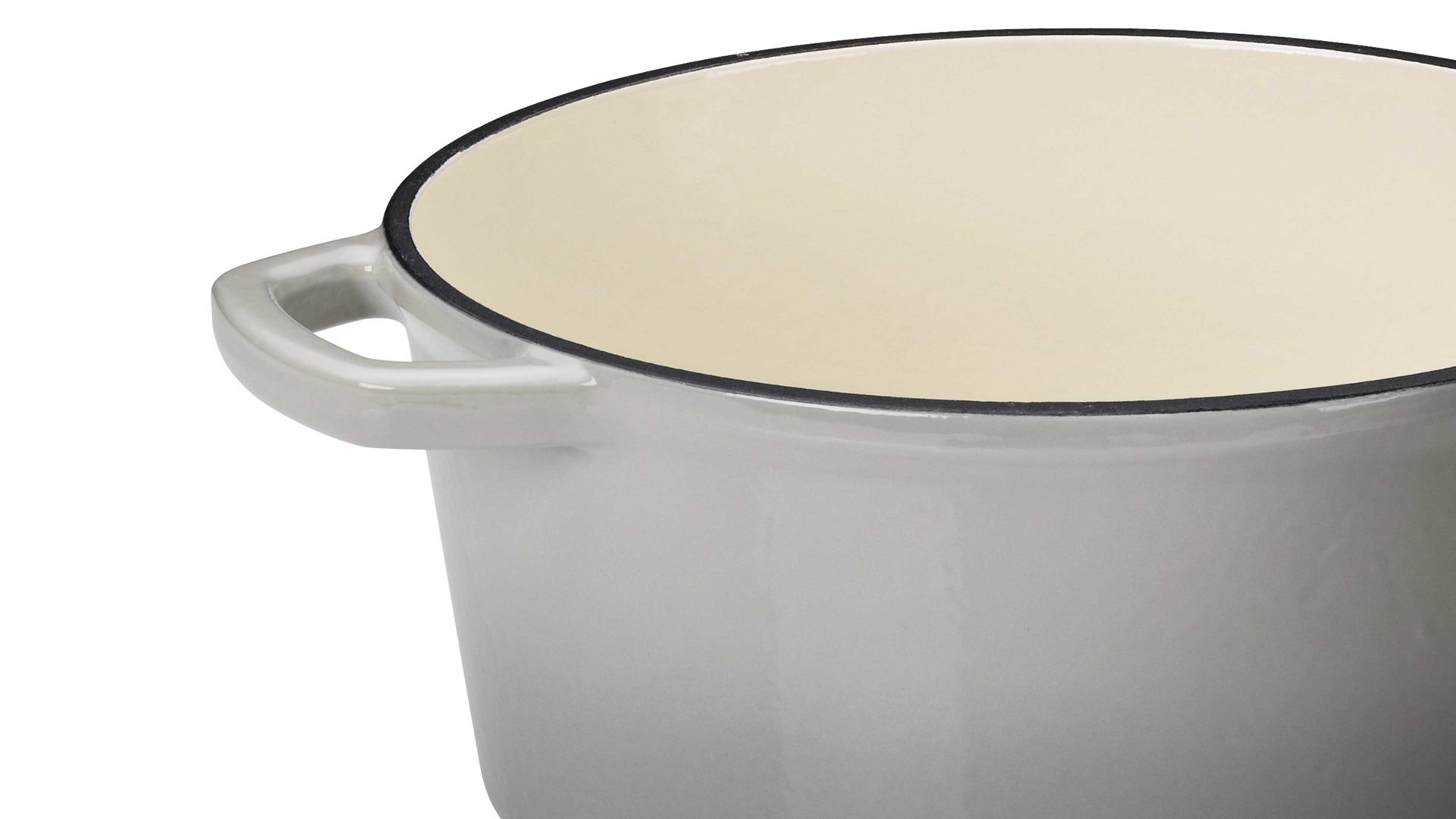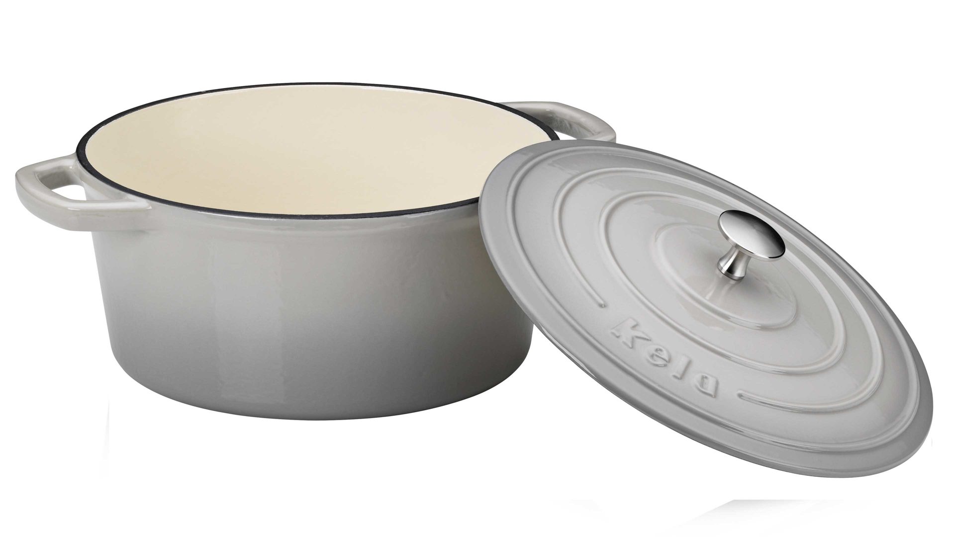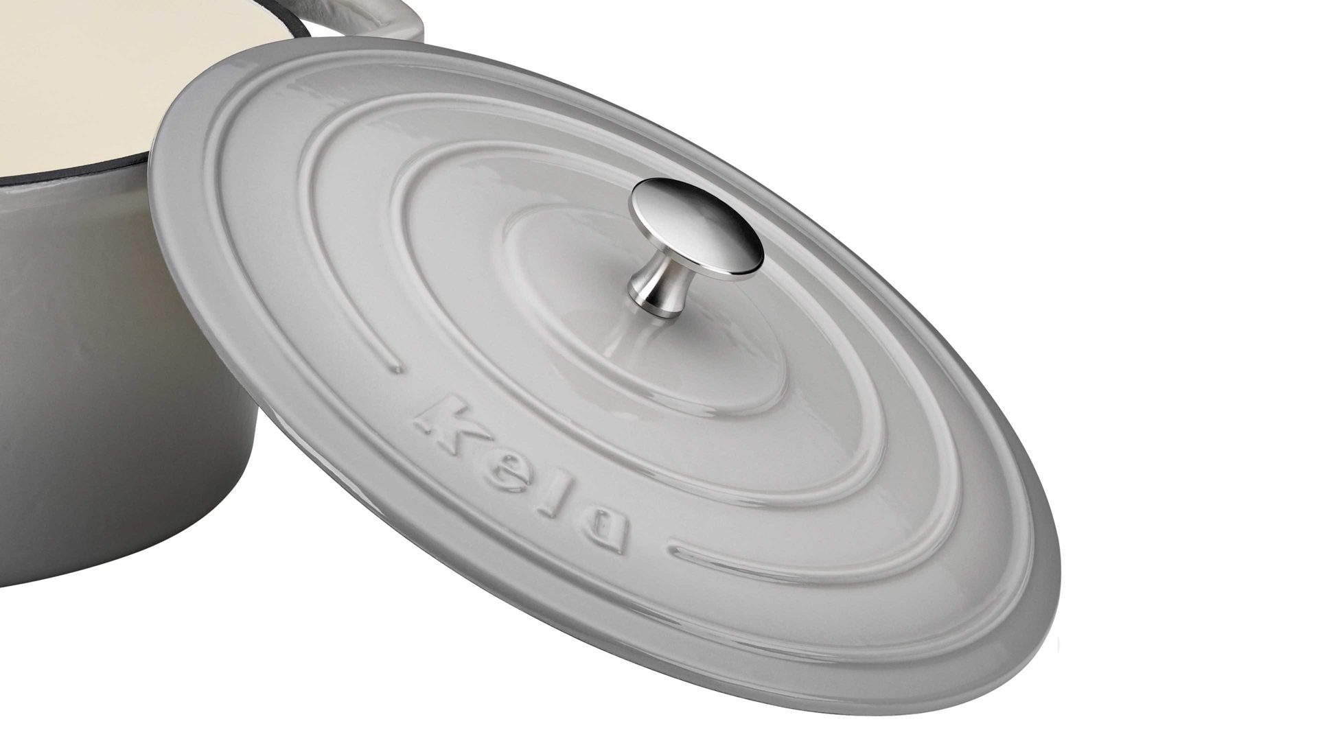 kela Bräter Calido | Gusseisen mit glatter, hellgrauer Emaille-Beschichtung innen und außen | Größe Durchmesser ca. 26 x 12 (DxH) | Bodenfläche ca. 20 cm (Durchmesser) | Inhalt ca. 4,6 Liter | Edelstahl-Deckelknopf | große Griffe | einfache Reinigung | gleichmäßige Hitzeverteilung | gute Wärmespeicherung | energiesparend | perfekt für Anbraten und Schmoren | backofenfest bis 300 Grad Celsius | für alle Herdarten geeignet, auch für Induktion | zehn Jahre Hersteller-Qualitätsgarantie | in verschiedenen Farben und Größen bestellbar