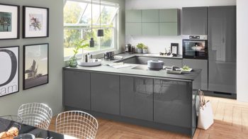 schiefergraue Lacklaminat-Hochglanzfronten mit edelstahlfarbenen Griffmulden und schiefergraue Korpusse