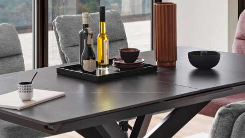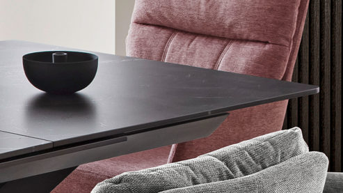 anthrazitfarben marmorierte Keramikplatte, kombiniert mit einem mattschwarz lackierten Metallgestell