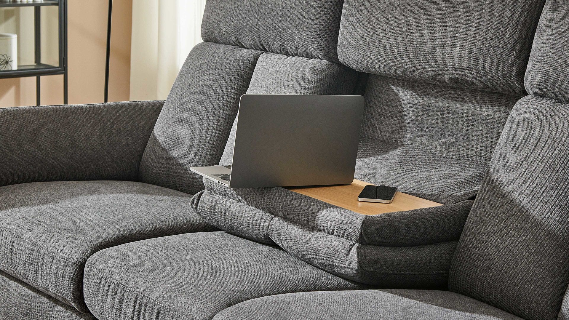 Die Tischfunktion ist ein Funktions-Mehrpreis für die Sofas aus dem hochwertigen Polsterprogramm OrthoSedis 4.0. Um sie anzuwenden, klappen Sie die mittlere Rückenlehne nach vorn. Auf diese Weise legen Sie die als Tisch nutzbare Holzablage in Eiche bianco auf der Rückseite der Lehne frei.