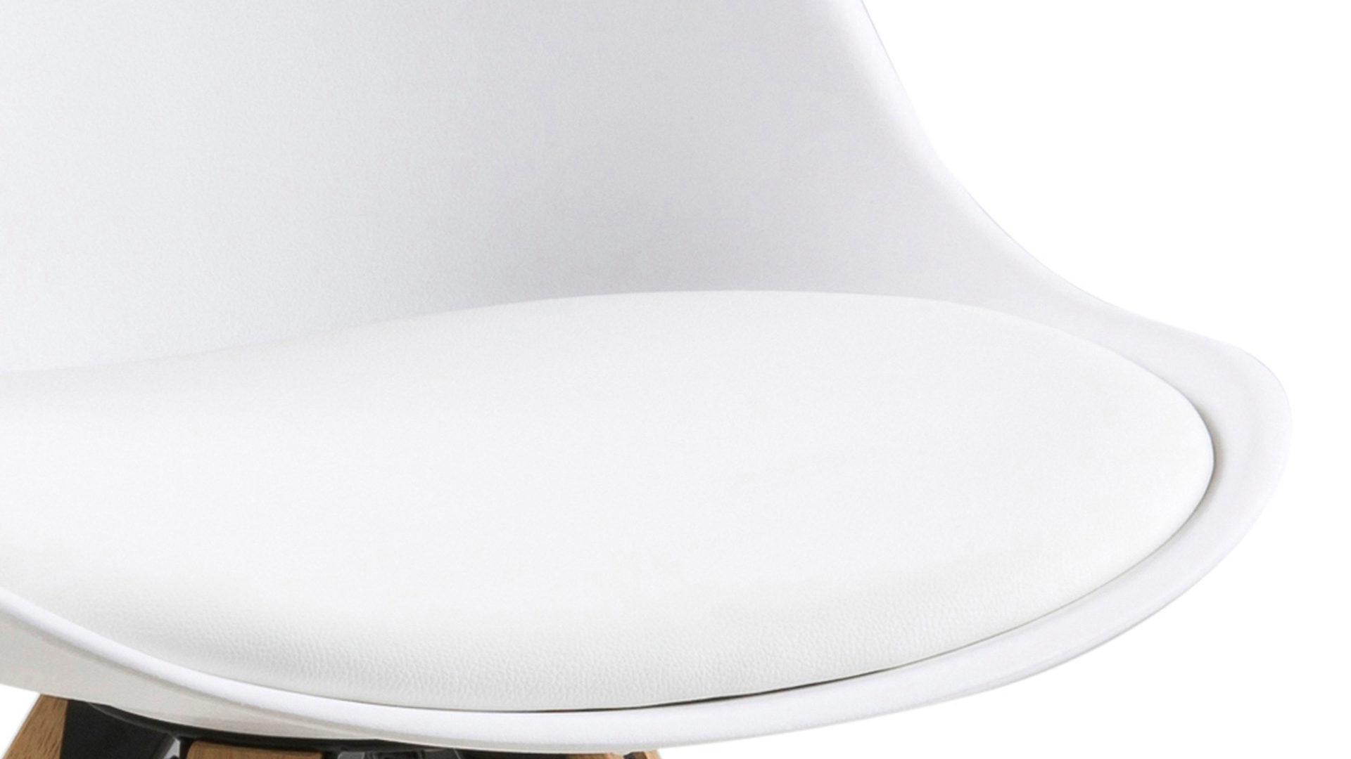Retro-Look in Perfektion: Mit diesem Stuhl zieht ein zeitloses Sitzmöbel in Ihr Esszimmer ein. Der weiße Esszimmerstuhl ist ein wahrer Klassiker und unterstreicht gekonnt den modernen skandinavischen Wohnstil. Dabei besteht die Sitzschale des Stuhles, die auf der Sitzfläche mit weißem Kunstleder bezogen ist, aus schneeweißem Kunststoff, wodurch sie besonders pflegeleicht ist.