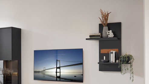 Mit den schwarzgrau lackierten Melaminoberflächen und der akzentuierenden Absetzung in furnierter, geölter Risseiche präsentiert sich das qualitativ hochwertige Wandregal aus dem Wohnmöbelprogramm Messina betont modern designt.