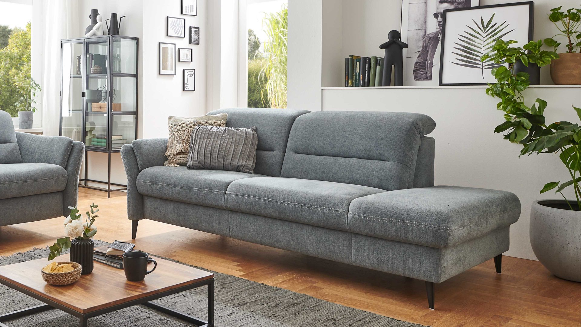 stahlfarbener Stoffbezug mit beiger Kontrast-Doppelsteppnaht