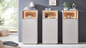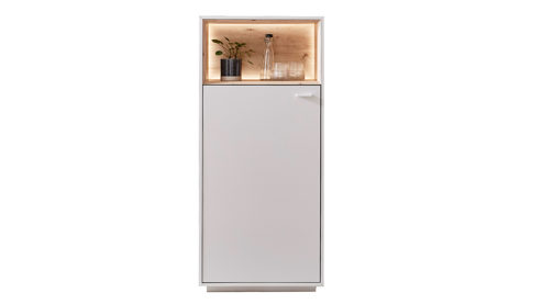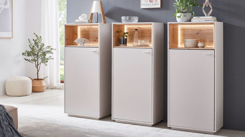 eintüriger Stauraumschrank, dahinter zwei höhenverstellbare Holzeinlegeböden
