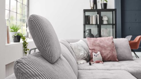 die Kopfstütze wird in die Kopfstützvorrichtung an der Rückenlehne des Sofas eingesteckt und lässt sich dann in der Höhe und in der Neigung manuell verstellen