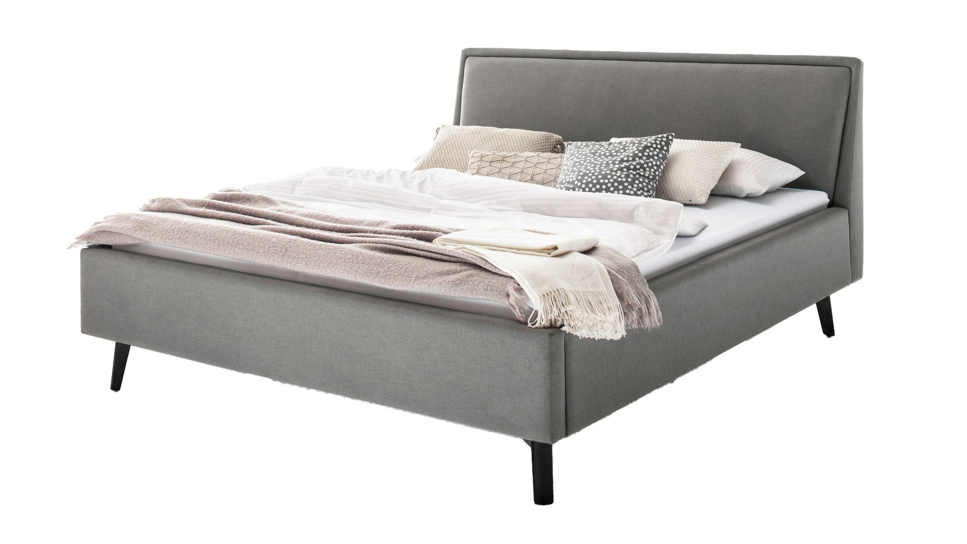 Die warme Farbe der Füße kontrastiert mit dem kühlen Ton des Bezugs - und doch harmonieren die beiden Nuancen hervorragend und verführen zu Traumreisen - beziehungsweise Reiseträumen - in natürliche Gefilde wie ein Gebirge mit schönen Bäumen. Ein weiteres Highlight des rundum überzeugenden Bettgestells bildet das glatt bezogene Polsterkopfteil. Dieses ermöglicht durch die weiche Haptik auch entspannt angelehntes Sitzen, etwa abends beim Lesen vor dem Schlafen oder morgens beim Blick aus dem Fenster zum Wachwerden.