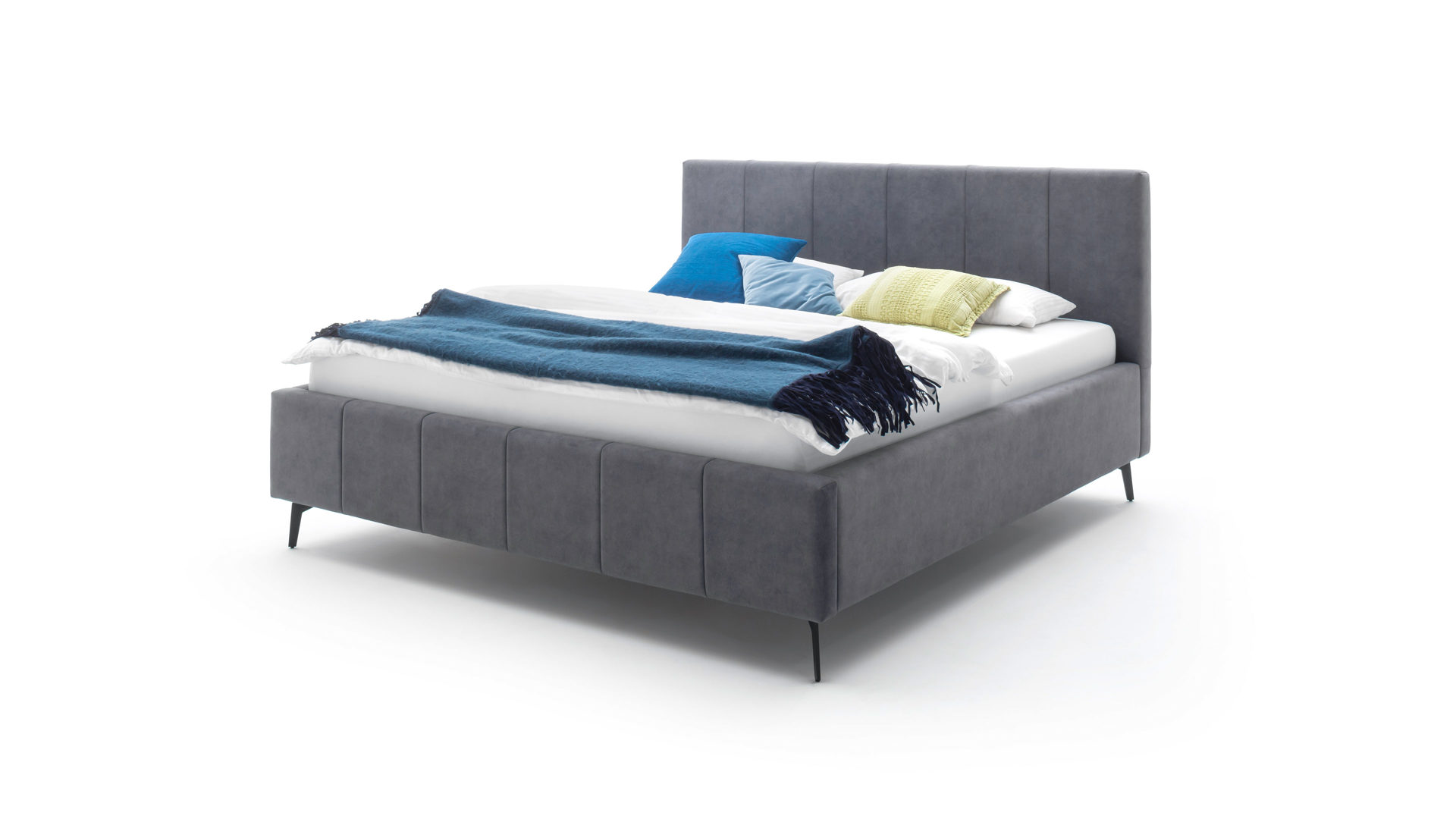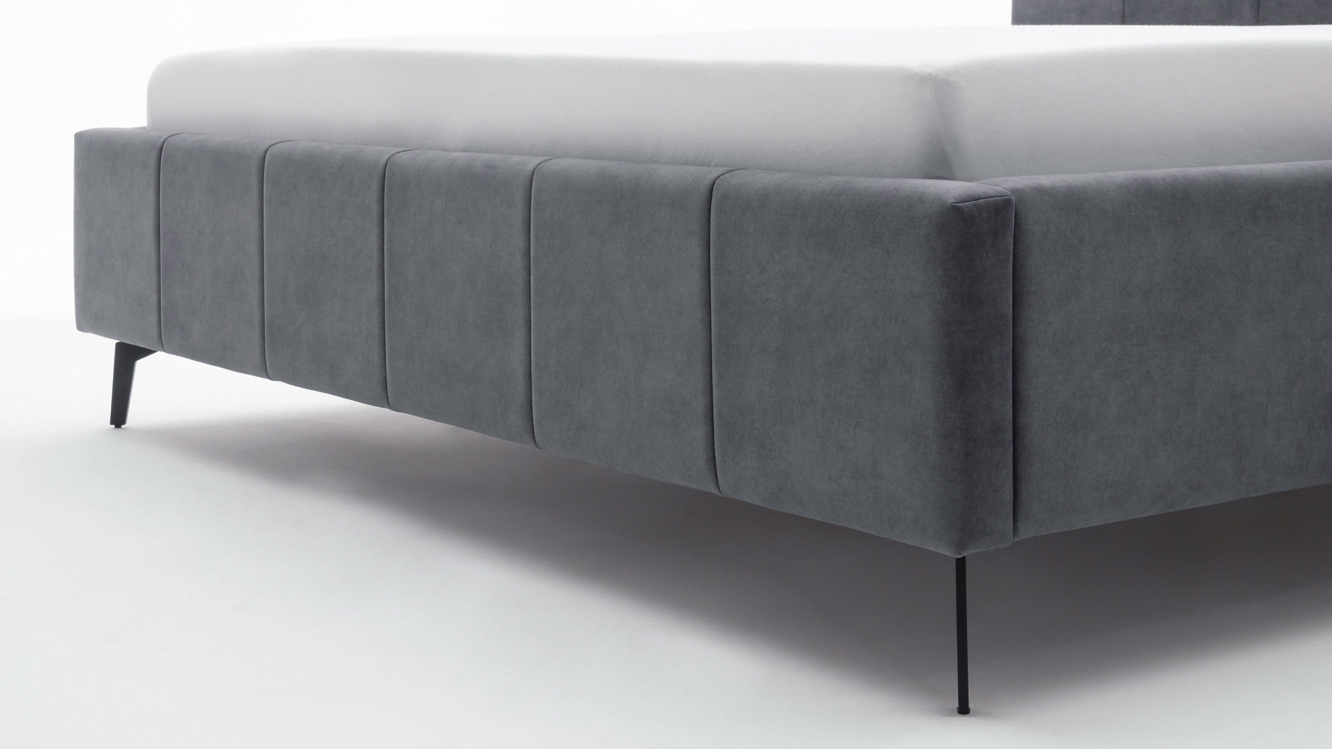 Senkrechte Einzüge zieren das komfortable Kopfteil: Machen Sie es sich daran beim abendlichen Schmökern bequem oder genießen Sie das Sonntagsfrühstück im Bett mit der weichen Rückenstütze.
