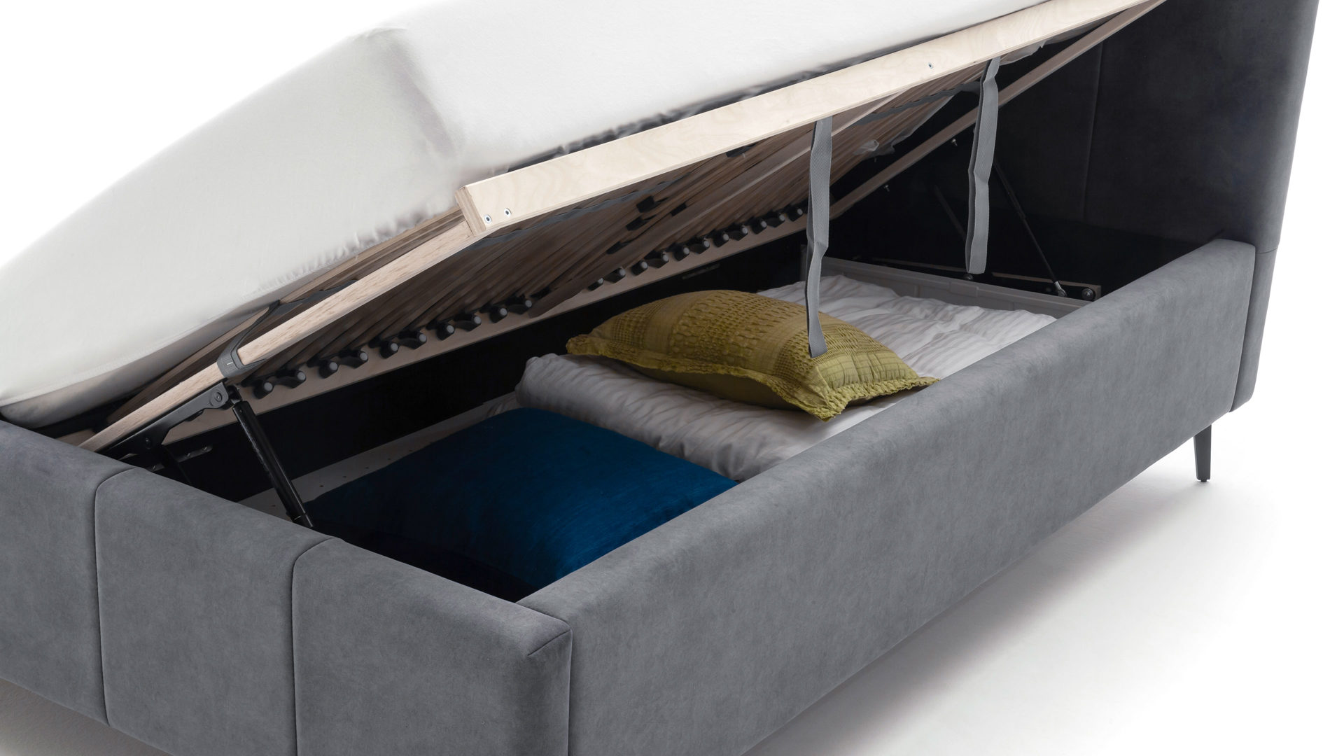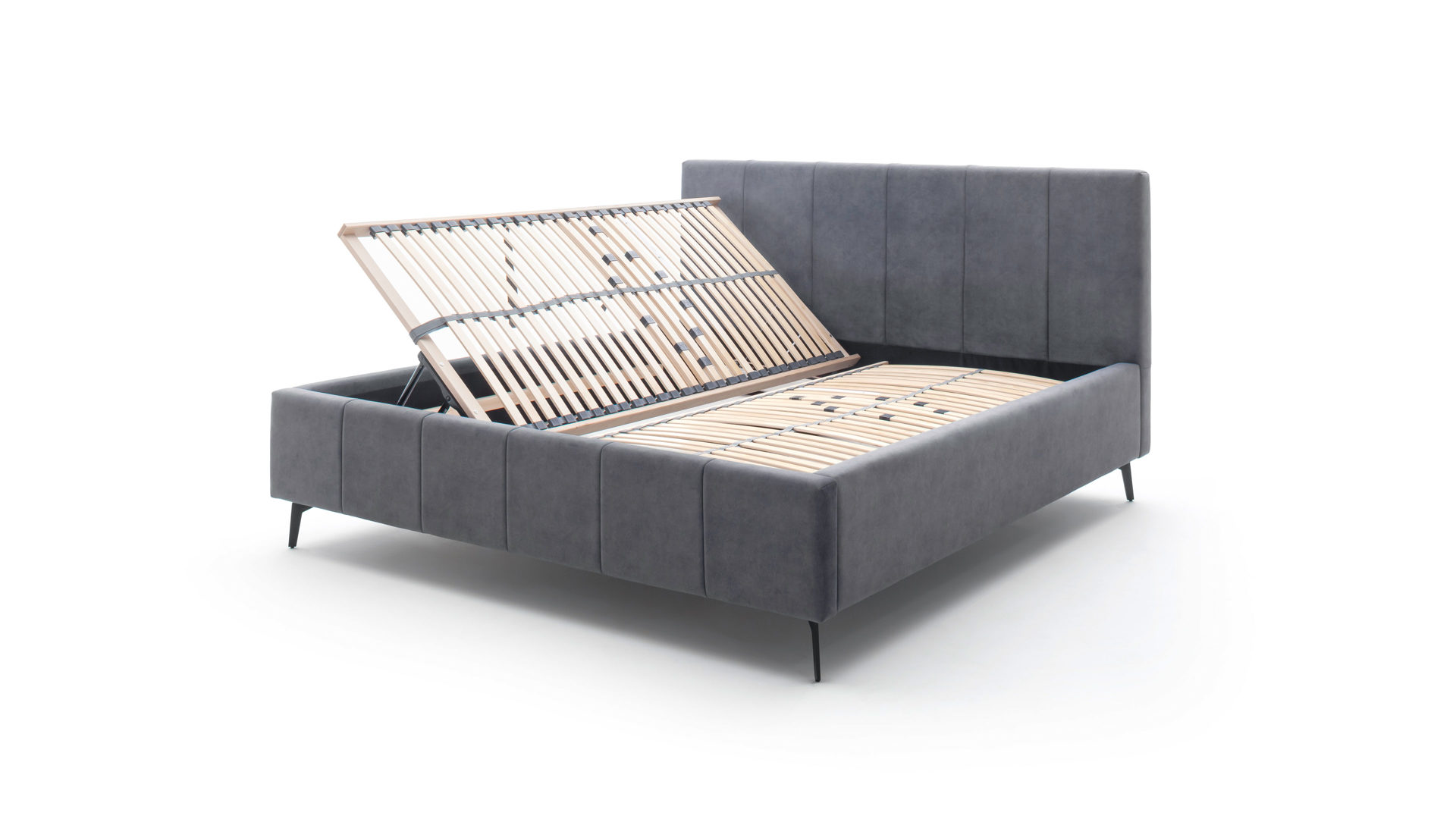 Unter einem seitlich zu öffnenden Federholzrahmen liegt ein geteilter und belüfteter Bettkasten. Der Lattenrost bringt 28 starre Leisten mit. Dank individueller Härtegradverstellung liegen Sie immer genau richtig: etwas weicher oder nach Belieben etwas fester gestützt.