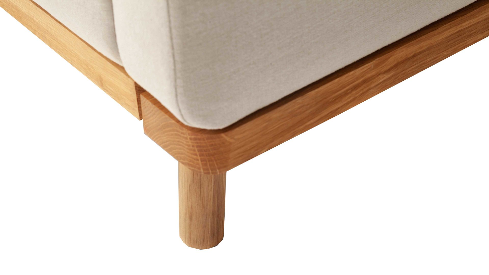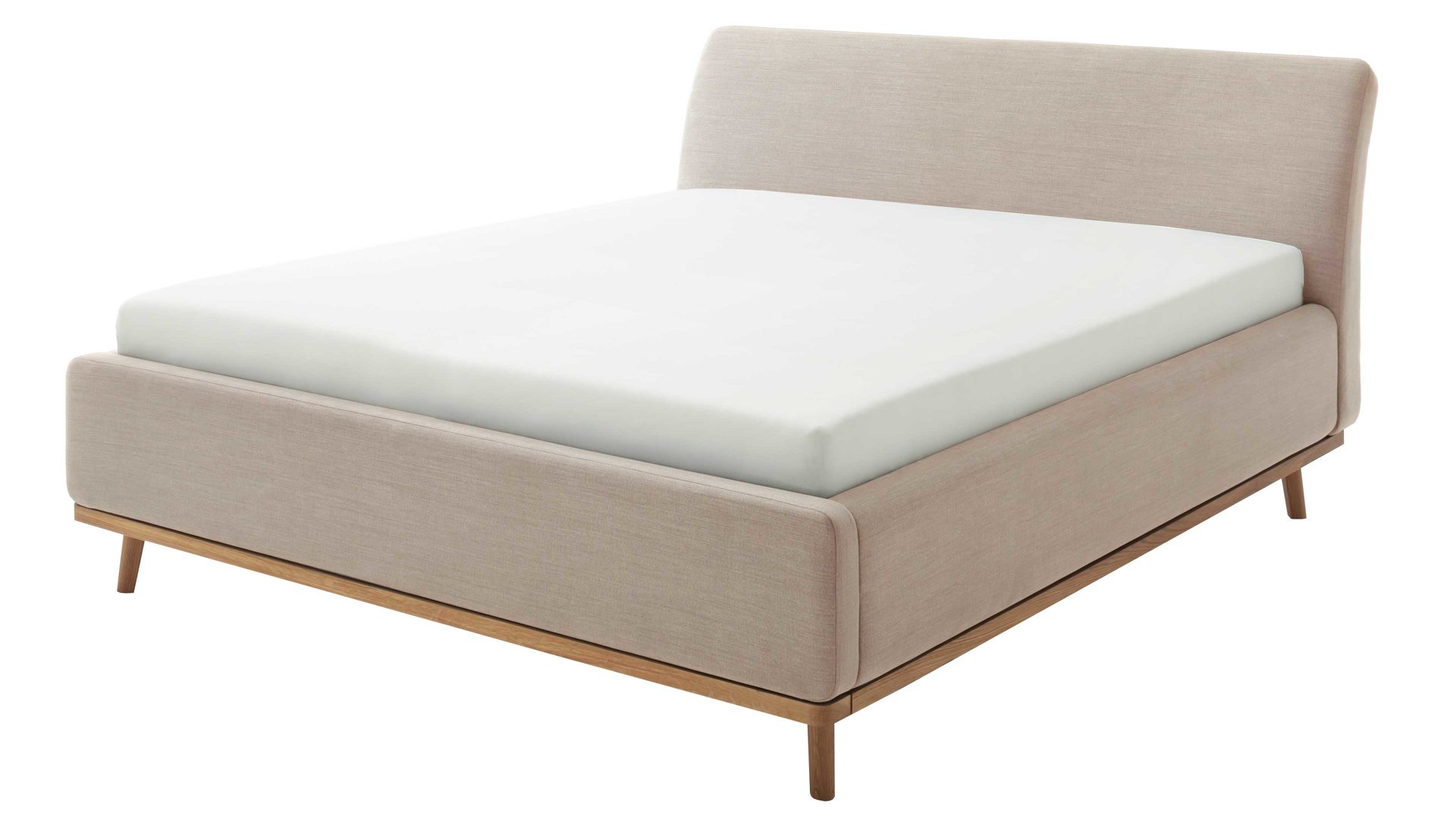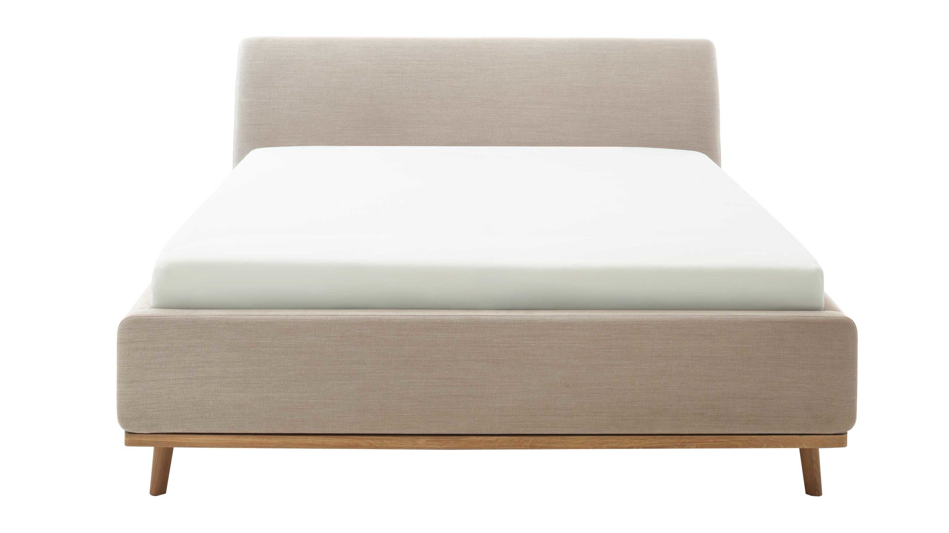 Pure Eleganz bringt das Polsterbettgestell Mila in Ihr Schlafzimmer. Es ruht auf einem eichefarbenen, massiven Holzrahmen. Die ebenfalls eichefarbenen Füße wirken filigran und verleihen diesem Modell eine luftig leichte Ausstrahlung. Ausgestattet ist das schicke Bett mit dem Bezug Capri 3723 aus beigem Flachgewebe.