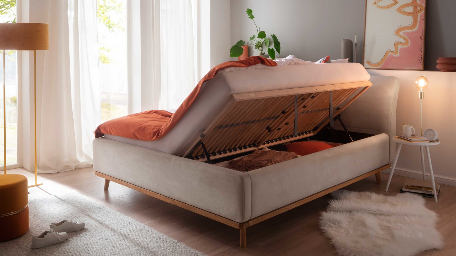 Im Inneren liegen zwei jeweils seitlich zu öffnende Federholzrahmen mit 28 starren Leisten. Dank der möglichen Härtegradverstellung liegen Sie immer genau richtig. Der integrierte Bettkasten ist belüftet und geteilt - für eine Extramaß an Ordnung und Stauraum bei dennoch optimaler Luftzirkulation.