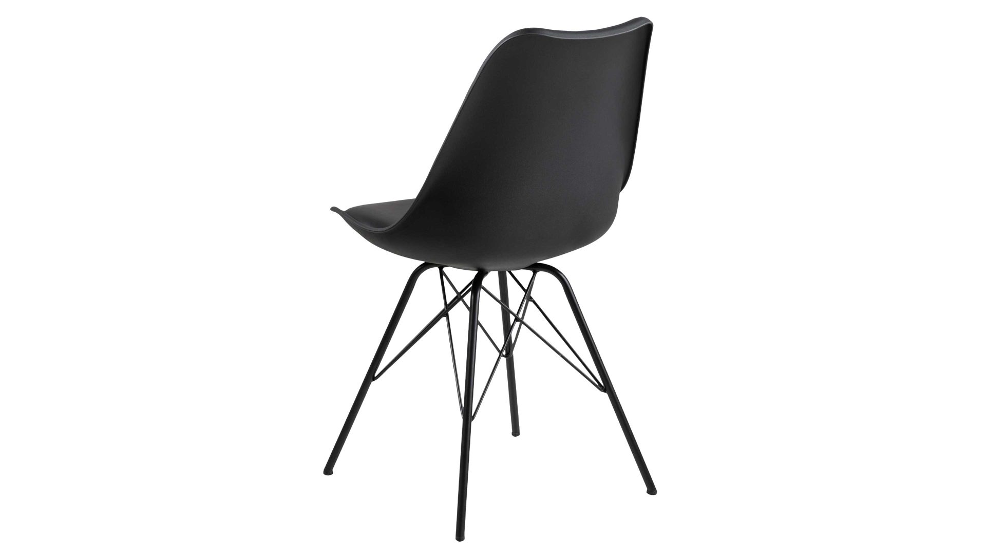 Dieser Polsterstuhl verkörpert schlichte Eleganz. Seine stabile, dabei aber wunderbar filigran designte Basis bildet ein mattschwarz pulverbeschichtetes Stahldrahtgestell. Darauf befindet sich eine schwarze Sitzschale aus robustem Kunststoff. Sie ist mit schwarzem Kunstleder bezogen, das sowohl qualitativ als auch optisch und haptisch überzeugt. Die Farbgebung sorgt für eine klassische Ausstrahlung.