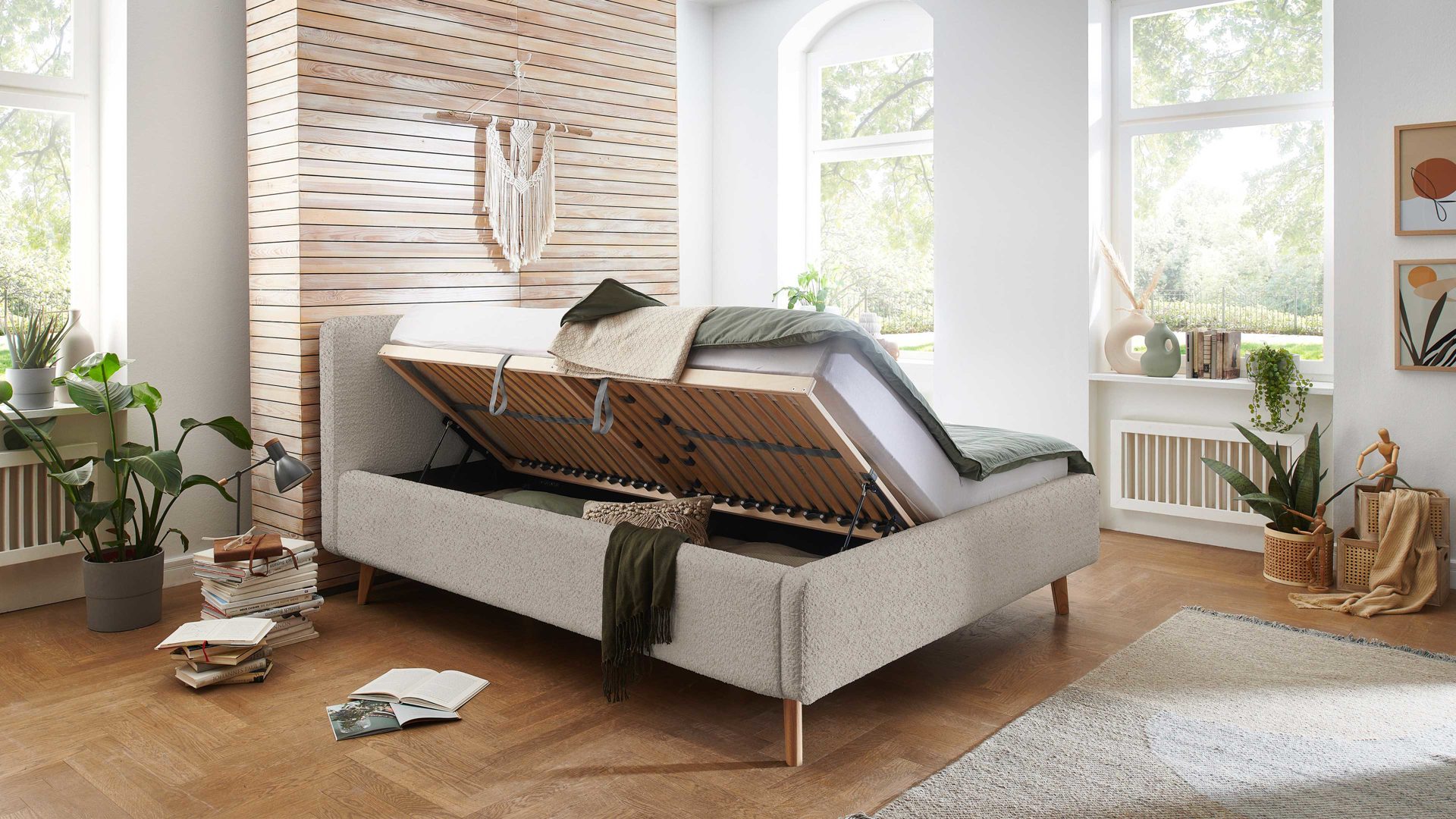 • Die Abbildung zeigt ein Wohnbeispiel. Im Lieferumfang enthalten ist ein Polsterbettgestell mit Kopfteil, Bettkasten und Federholzrahmen, wie beschrieben.