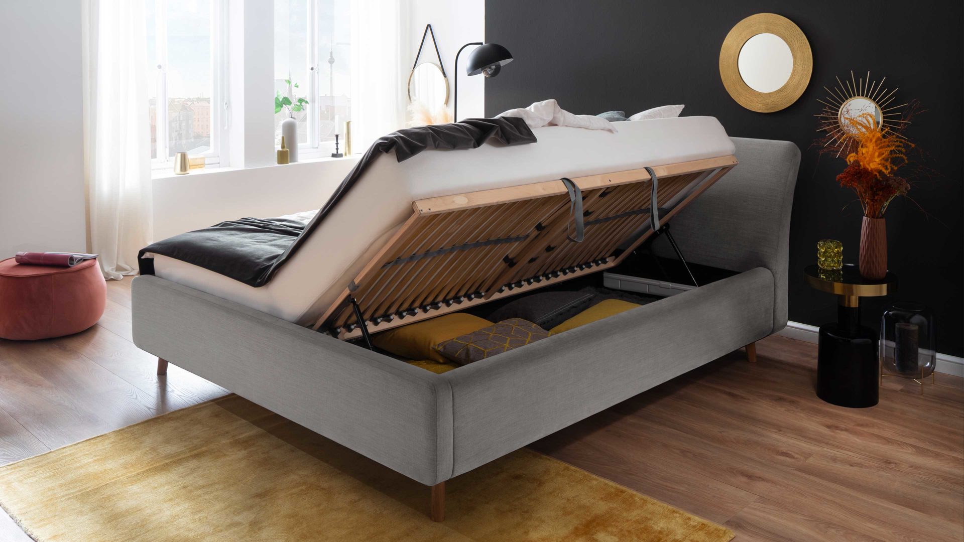 Im Inneren liegen zwei jeweils seitlich zu öffnende Federholzrahmen mit 28 starren Leisten. Dank der möglichen Härtegradverstellung liegen Sie immer genau richtig. Der integrierte Bettkasten ist belüftet und geteilt - für eine Extramaß an Ordnung und Stauraum bei dennoch optimaler Luftzirkulation.
