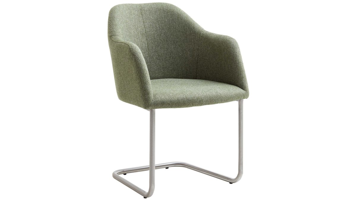 Darüber hinaus weiß er in puncto Komfort zu überzeugen. Ein Edelstahlgestell bildet die robuste Basis. Das widerstandsfähige Material sorgt für die nötige Stabilität und die klassische Farbgebung bringt edles Flair in den Raum. Attraktiv abgerundet wird der Schwingstuhl durch den blassgrünen Webstoffbezug. Die außergewöhnliche Farbe wirkt elegant und harmoniert bestens mit dem Gestell. Einen feinen Akzent setzt die Steppnaht im Rücken des Schalensitzes.