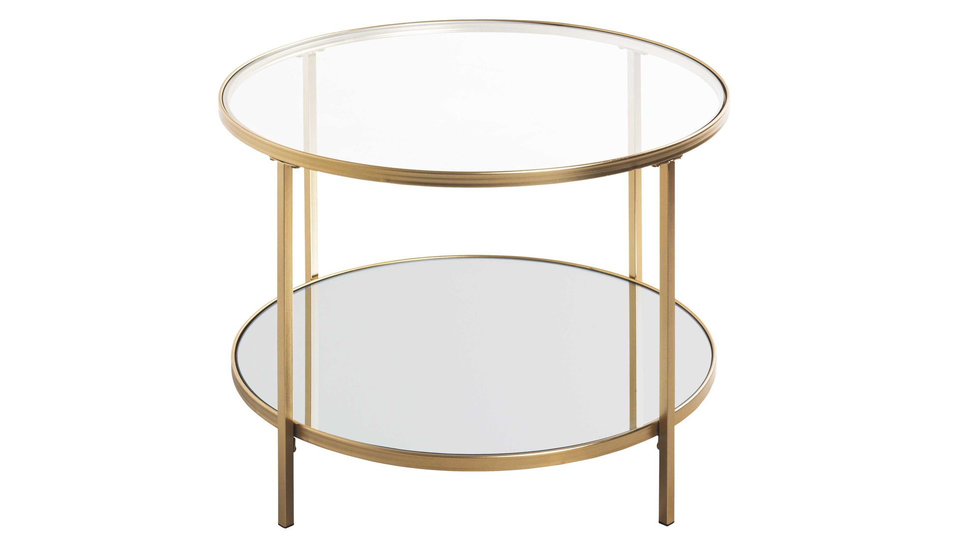 Der Beistelltisch ist mit seinem modernen und eleganten Design ein absoluter Hingucker. Er kombiniert ein goldfarben lackiertes Metallgestell mit zwei Ablagen: Die obere besteht aus Sicherheitsglas und die untere aus Spiegelglas. Dank der hochwertigen Materialien ist das Tischchen robust, widerstandsfähig und langlebig. Seine Maße belaufen sich auf ca. 45 x 60 cm (HxD).