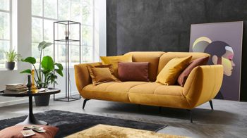 Dieser Dreisitzer aus dem Polsterprogramm New Jersey zeichnet sich durch seine moderne und gemütliche Ausstrahlung, eine exzellente Material- und Verarbeitungsqualität sowie extra hohen Sitzkomfort aus. Der trendige und spezielle senffarbene Stoffbezug sorgt für ein edles Design. Mattschwarze Metallfüße runden die Optik stimmig ab und tragen überdies zur Stabilität des attraktiven Sofas bei. Einen gelungenen Akzent setzt die gesteppte Sitzfläche. Der Rücken der Couch ist glatt bezogen.