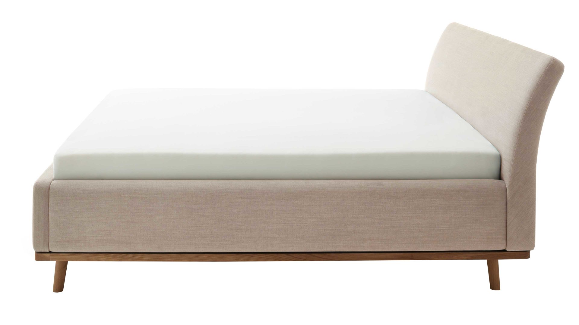 Pure Eleganz bringt das Polsterbettgestell Mila in Ihr Schlafzimmer. Es ruht auf einem eichefarbenen, massiven Holzrahmen. Die ebenfalls eichefarbenen Füße wirken filigran und verleihen diesem Modell eine luftig leichte Ausstrahlung. Ausgestattet ist das schicke Bett mit dem Bezug Capri 3723 aus beigem Flachgewebe.