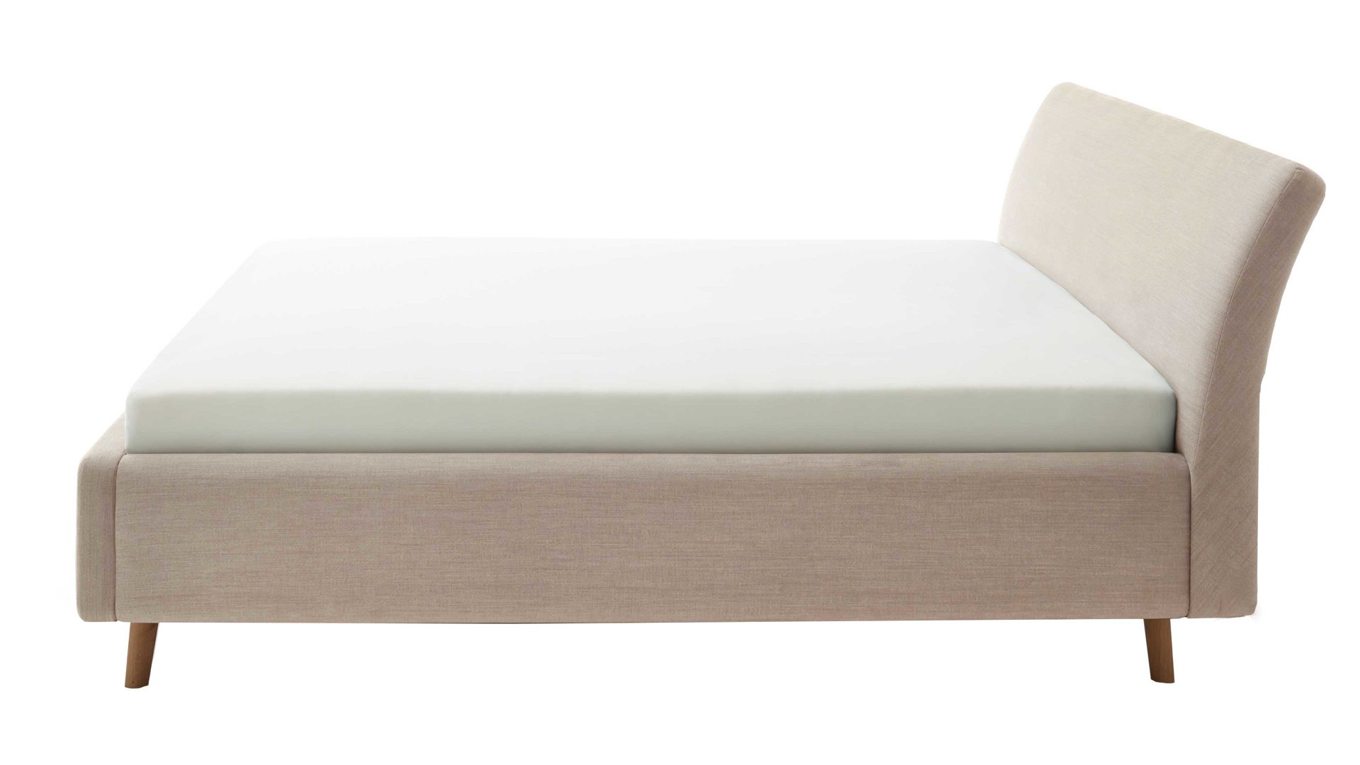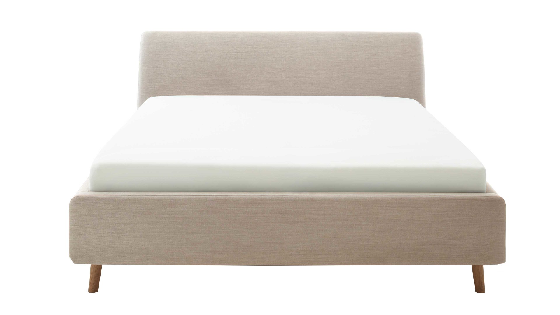 Pure Eleganz bringt das Polsterbettgestell Mila in Ihr Schlafzimmer. Die eichefarbenen Füße wirken filigran und verleihen diesem Modell eine luftig leichte Ausstrahlung. Ausgestattet ist das schicke Bett mit dem Bezug Capri 3723 aus beigem Flachgewebe.