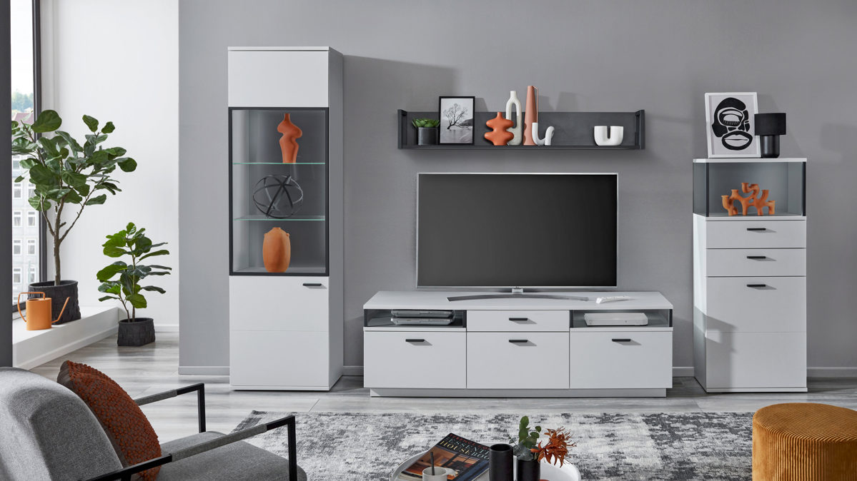 • Die Abbildung zeigt ein Wohnbeispiel, welches auch Dekoration sowie separat erhältliches Zubehör enthält. Im Lieferumfang enthalten ist eine Wohnwand.