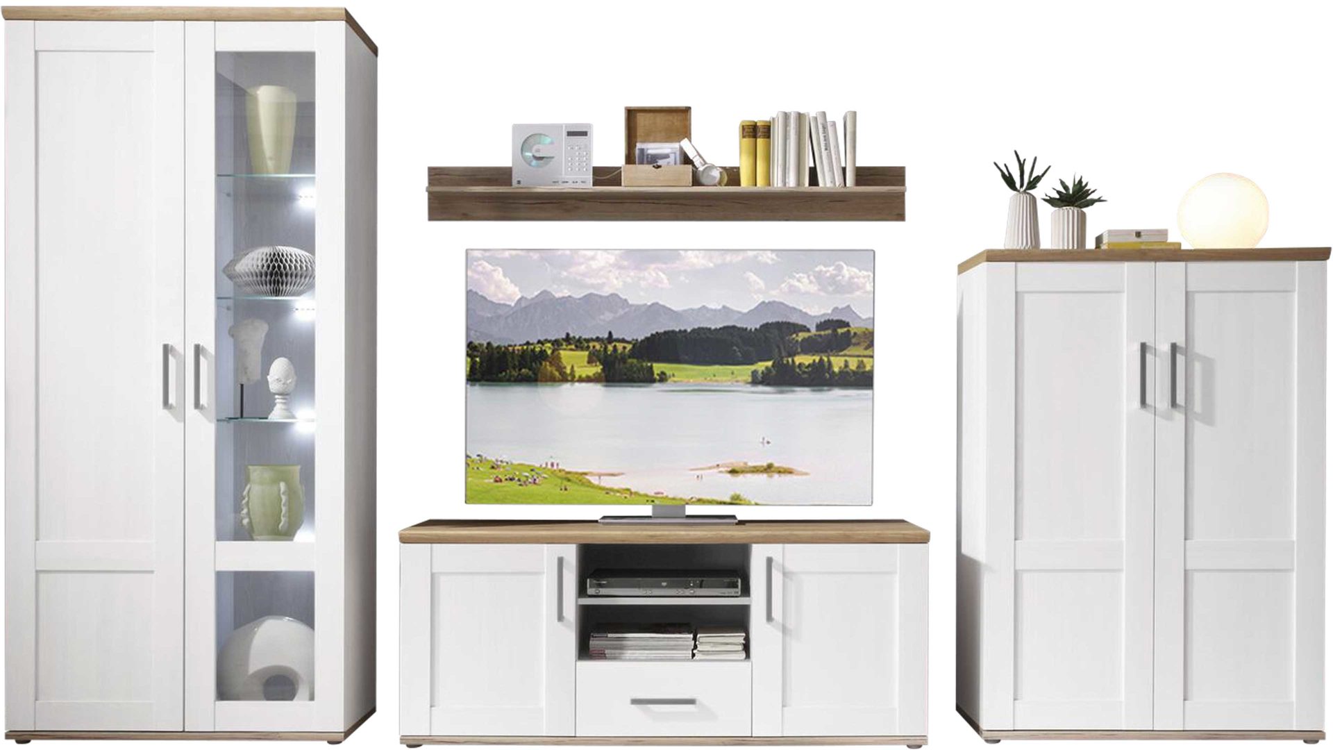 Ein Einrichtungstraum im skandinavischen Landhausstil ist diese vierteilige Wohnwand, die Maße von ca. 329 x 200 x 50 cm (BxHxT) aufweist. Gefertigt wurde sie aus Sibiu Lärche-Nachbildung in Kombination mit hellen San Remo Kunststoffoberflächen. Ein stattlicher Vitrinenschrank mit einer Holztür sowie einer Glastür, Maße ca. 93 x 202 x 46 cm (BxHxT), wird zum Blickfang der Wohnkombination. In seinem Inneren verbergen sich vier Glas- sowie vier Holzböden. Kaltweiße LED-Beleuchtung setzt die Glasböden der Vitrine geschmackvoll in Szene. Ein Wandboard mit Rückwand, Maße ca. 143 x 17 x 24 cm (BxHxT), kann als Abstellfläche für Bücher, DVDs oder Dekoaccessoires genutzt werden.