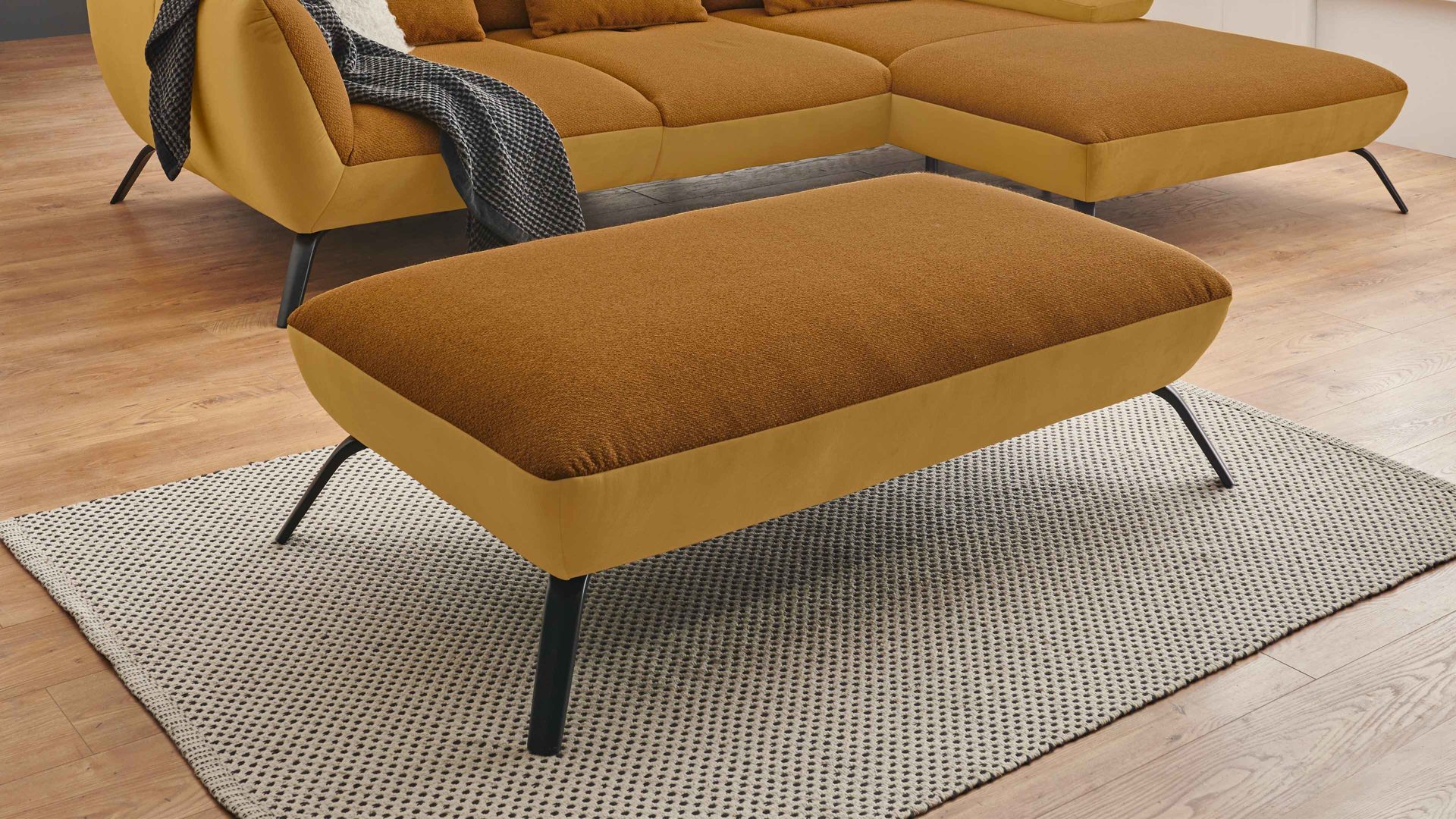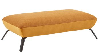 Er verbindet eine Stoffkombination aus senffarbenem Flachgewebe und goldfarbener Maschenware mit mattschwarzen Metallfüßen. Dank der hochwertigen PUR-Schaumpolsterung auf einer erstklassigen Wellenunterfederung genießen Sie auf diesem Hocker hervorragenden Sitzkomfort.