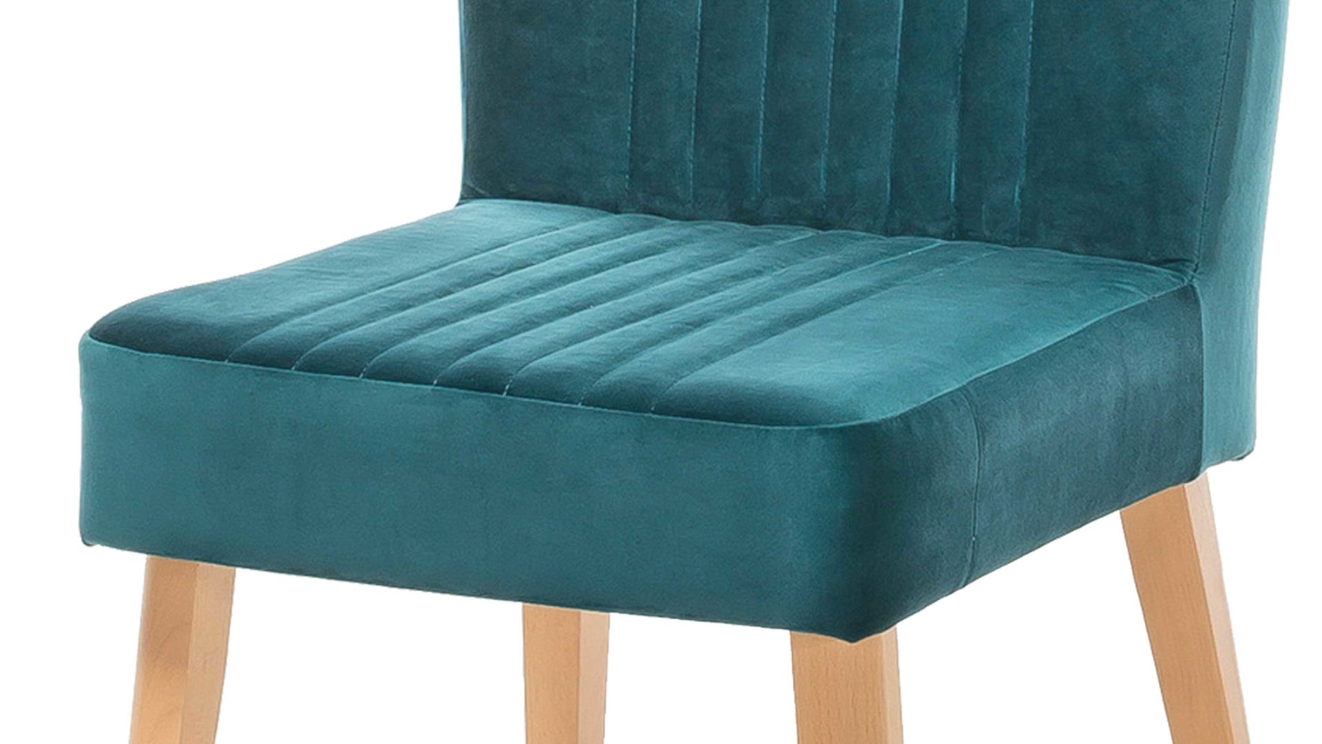 Ein farblicher Hingucker ist der hochwertige Polsterstuhl mit petrolfarbenem Bezug im modernen Samtlook. Aufwendige Steppnähte, die auf Sitz und Rücken angebracht sind, geben dem Sitzmöbel zusätzlich eine interessante Optik. Am besten passt der Polsterstuhl mit den Maßen von ca. 46 x 92 x 66 cm (BxHxT) an einen Esstisch aus Eiche, da auch das Holzgestell aus Eiche natur ist.