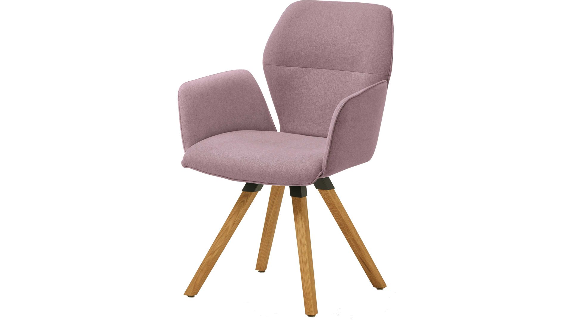 Der Armlehnstuhl Merlot präsentiert sich modern, kreativ und stilvoll designt. Er kombiniert einen auberginefarbenen Webstoffbezug mit einem Stativ-Gestell aus massivem Wildeichenholz und schwarzen Akzenten. Das Echtholz sorgt für eine stabile Basis sowie für natürliches und warmes Flair im Esszimmer. Dazu trägt auch der charmante Farbton des hochwertigen, angenehm weichen Stoffbezugs bei. Überdies unterstreicht die spezielle Formensprache des Gestells die originelle Ausstrahlung des Vierfußstuhls.