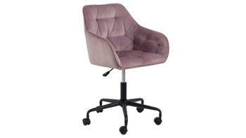 Dabei harmoniert der Drehstuhl in seiner sanften Formensprache mit zahlreichen Einrichtungsstilen: Dafür sorgt der pastellrosa Samtbezug, der die gesamte Sitzschale inklusive der bequemen Armlehnen weich umhüllt. Das pulverbeschichtete Metall-Drehkreuz fließt in mattem Schwarz stimmig in das Gesamtbild ein.