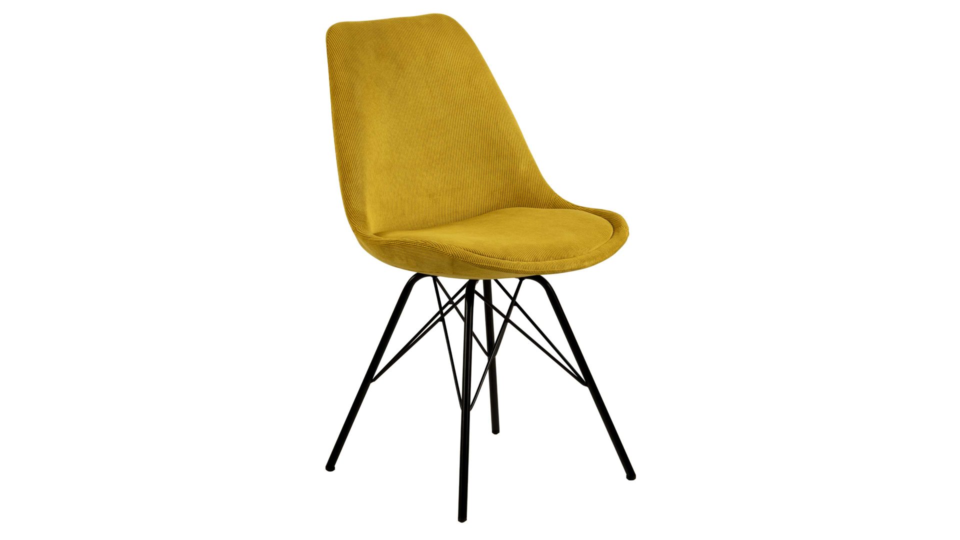 Dieser Polsterstuhl verkörpert klassische Eleganz. Als stabile, dabei aber wunderbar filigran designte Basis fungiert ein mattschwarz pulverbeschichtetes Stahldrahtgestell. Darauf befindet sich eine gelbe Sitzschale aus robustem Kunststoff. Sie ist rundherum mit Feincord bezogen, ebenfalls in warmem Gelb. Der angesagte Feincordbezug überzeugt sowohl qualitativ als auch optisch und haptisch.