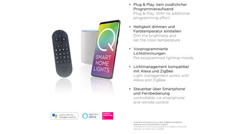 Q-intelligentes Licht mit Farbtemperaturwechsel und dimmbare Helligkeit - per Funk-Fernbedienung oder per APP steuerbar, mit Memory-Funktion