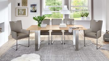 Das steinfarbene Leder und die Holzfüße in Eiche Bianco machen dieses elegantes Sitzmöbel zu etwas ganz Besonderem. Und so macht der Polsterstuhl mit den Maßen von ca. 55 x 98 x 60 cm (BxHxT) als Flurmöbel, im Gästezimmer oder als Schlafzimmermöbel solo eine gute Figur. Zu mehreren stellen Sie den Armlehnstuhl mit hübschen Ziernähten rund um Ihren Esstisch in der Küche oder im Wohnzimmer.