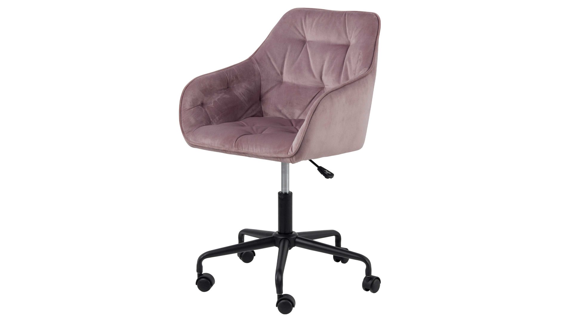 Dabei harmoniert der Drehstuhl in seiner sanften Formensprache mit zahlreichen Einrichtungsstilen: Dafür sorgt der pastellrosa Samtbezug, der die gesamte Sitzschale inklusive der bequemen Armlehnen weich umhüllt. Das pulverbeschichtete Metall-Drehkreuz fließt in mattem Schwarz stimmig in das Gesamtbild ein.