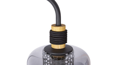 die Fassung ist in naturfarbenes Holz eingelassen, die mit schwarzem Textilkabel umwickelt ist