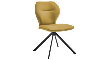 Er kombiniert ein mattschwarz lackiertes Stativgestell aus robustem Eisen mit einem gelben Mikrofaserbezug in Lederoptik und fügt sich in verschiedene Wohnstile harmonisch ein. Zu den optischen Highlights des Esszimmerstuhls gehört neben der Formensprache und den perfekt aufeinander abgestimmten Farben der markante Quereinzug im Rücken.