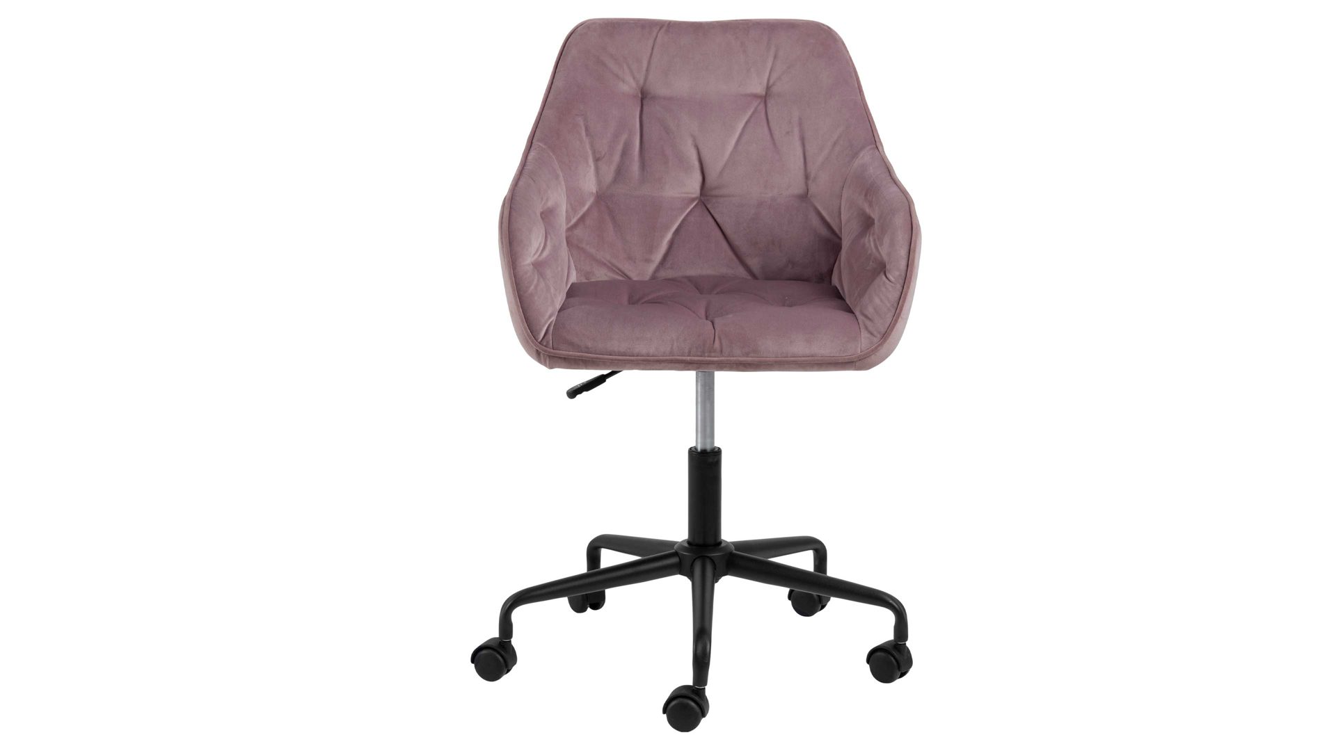 Dabei harmoniert der Drehstuhl in seiner sanften Formensprache mit zahlreichen Einrichtungsstilen: Dafür sorgt der pastellrosa Samtbezug, der die gesamte Sitzschale inklusive der bequemen Armlehnen weich umhüllt. Das pulverbeschichtete Metall-Drehkreuz fließt in mattem Schwarz stimmig in das Gesamtbild ein.