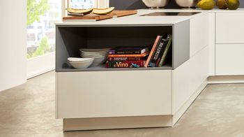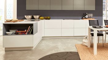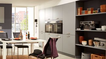 Die WERT KÜCHE® Nova beeindruckt mit der attraktiven Kombination aus matten kristallweißen und matten achatgrauen Fronten. Ebenfalls in leuchtendem Kristallweiß beziehungsweise Weiß präsentieren sich der Korpus und die Arbeitsplatten. Durch den gelungenen Hell-Dunkel-Kontrast und die grifflose Frontgestaltung strahlt die Systemküche pure Eleganz aus.
