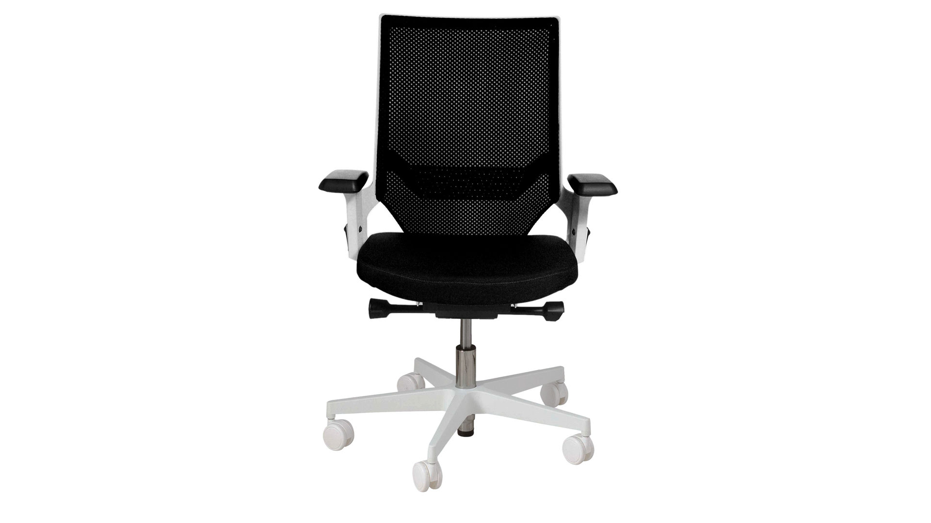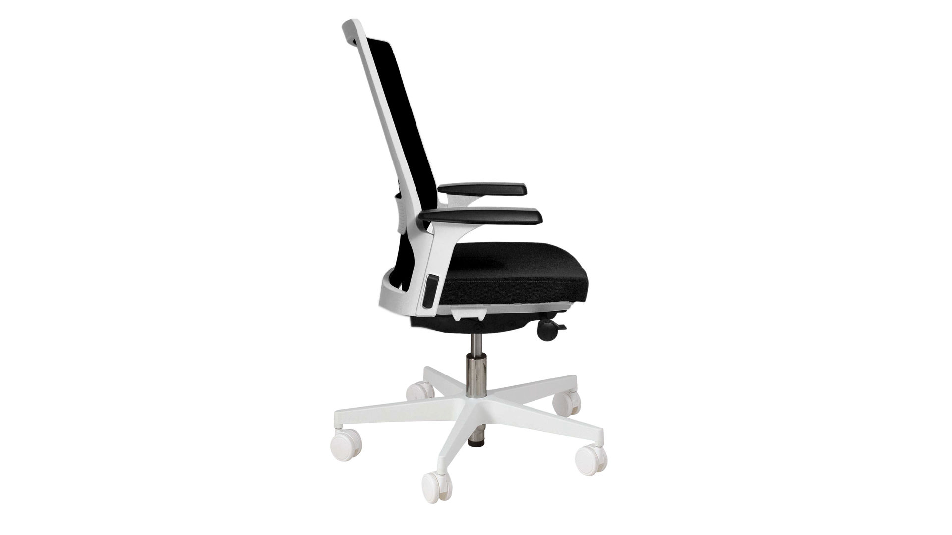 Der stilvolle Topstar Drehstuhl Autosyncron-1 kombiniert klassisch schwarzen Stoff- und Meshbezug mit einem weißen Kunststoff-Drehkreuz. Ebenfalls weiße Metall-Armlehnen mit einer wiederum schwarzen Polsterauflage runden das schwarz-weiße Design dieses modernen Bürostuhls harmonisch ab.