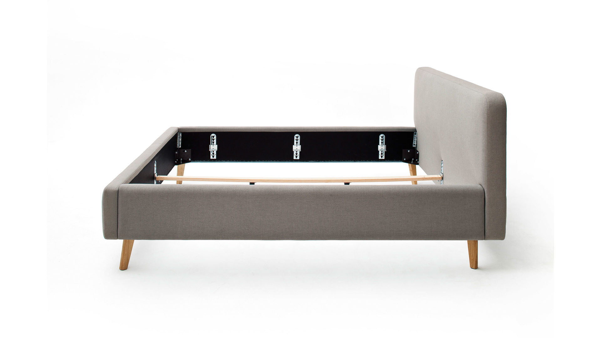 Das Polsterbettgestell Mattis begeistert durch die elegante Optik sowie die hervorragende Material- und Verarbeitungsqualität. Es kombiniert einen taupefarbenen Flachgewebe-Bezug mit eichefarbenen Holzfüßen. Sowohl die Bettseiten als auch das Polsterkopfteil sind glatt bezogen. Letzteres lädt Sie ein, sich anzulehnen, wenn Sie abends im Bett vor dem Schlafen noch fernsehen oder in einem Buch lesen.