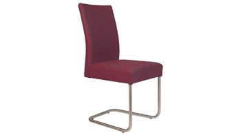 Der bequeme Esszimmerstuhl überrascht neben einem hohen Sitzkomfort mit einer ansprechenden Optik. Denn der Freischwinger besticht insbesondere durch den rubinroten Lederbezug und dem Edelstahlfuß aus Flachstahl, der sich mit einer gebürsteten Oberfläche präsentiert. Dank dieser Materialauswahl wirkt das Sitzmöbel ohne Armlehnen besonders modern.