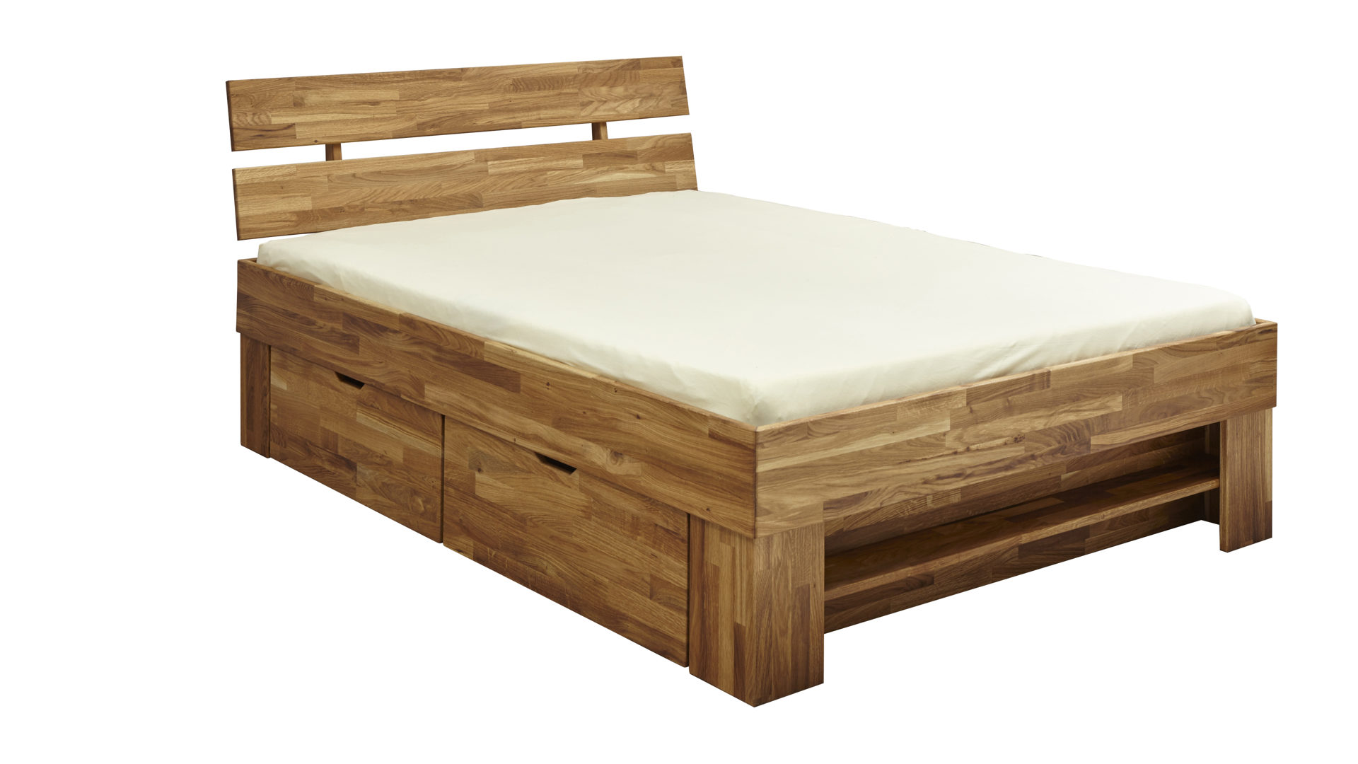 Im Fußteil des Massivholzbettes befindet sich ein funktionaler Regalboden, den Sie ebenfalls zum Verstauen diverser Utensilien nutzen. Die Bettseitenhöhe beträgt ca. 18 cm, die Einlegetiefe ca. 16 cm. Die Lieferung des Massivholzmöbels bzw. Bettgestells erfolgt ohne Lattenrost und Matratze.