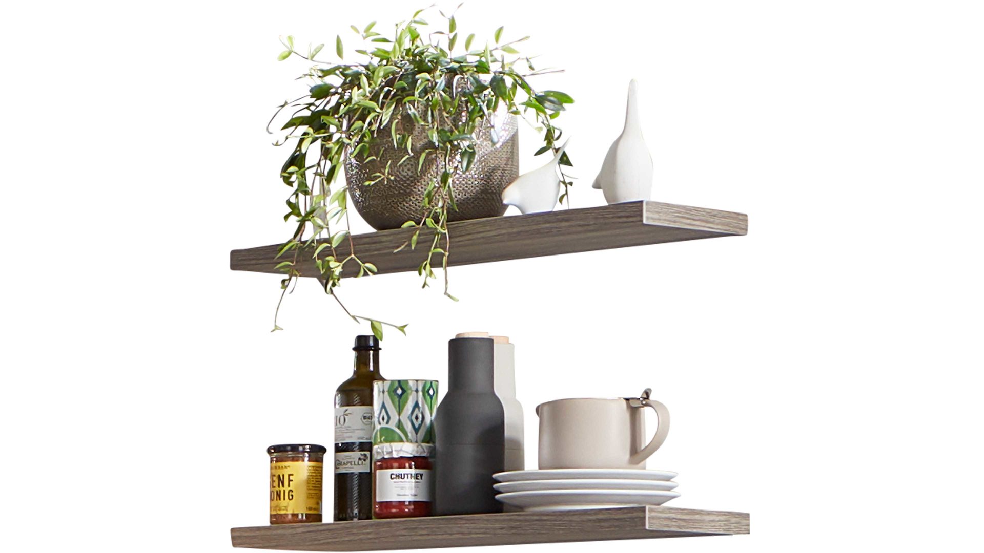 Gelungene Akzente setzen die Frontbereiche, Arbeitsplatten und Regalböden in attraktiver Virginia Eiche-Nachbildung. Der charmante Farbton verleiht der Planküche Made in Germany eine natürliche und warme Ausstrahlung. Edelstahlfarbene Griffe runden die moderne Optik harmonisch ab.