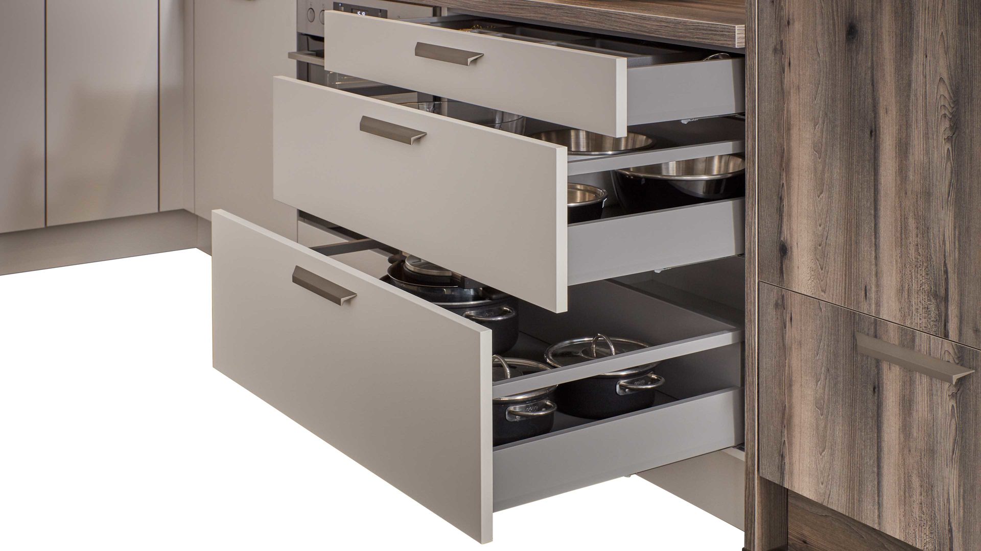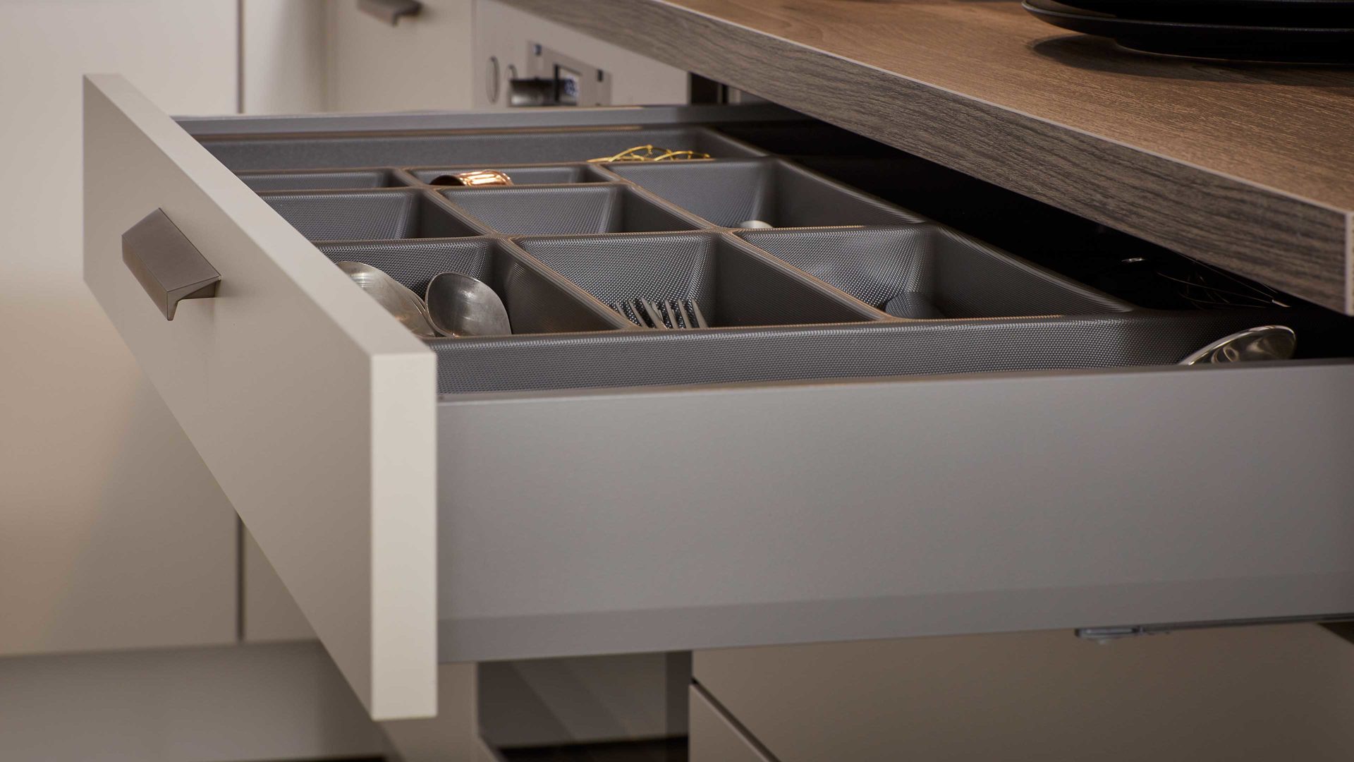 Bei der stilvollen WERT KÜCHE® Nora sind der Korpus, die Sockelblenden und der Großteil der Fronten muschelweiß und damit besonders edel gestaltet.