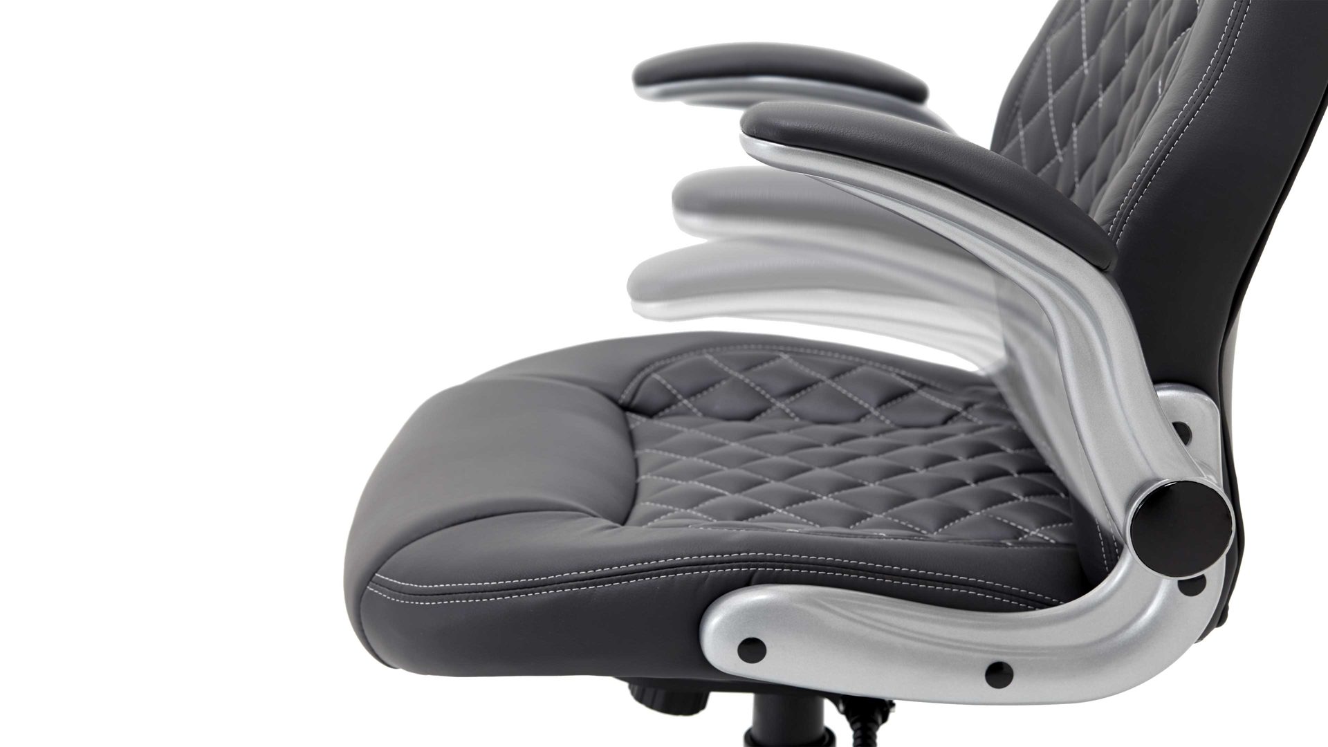 Der Drehstuhl begeistert mit einem anthrazitfarbenen Kunstlederbezug und einem silberfarbenen Nylon-Drehkreuz. Stellen Sie das bequeme Büromöbel an Ihren Schreibtisch, wo es mit den Maßen von ca. 68 x 116 – 126 x 68 cm (BxHxT) perfekt hinpasst. Durch die klappbaren sowie gepolsterten Armlehnen ist entspanntes Arbeiten garantiert.