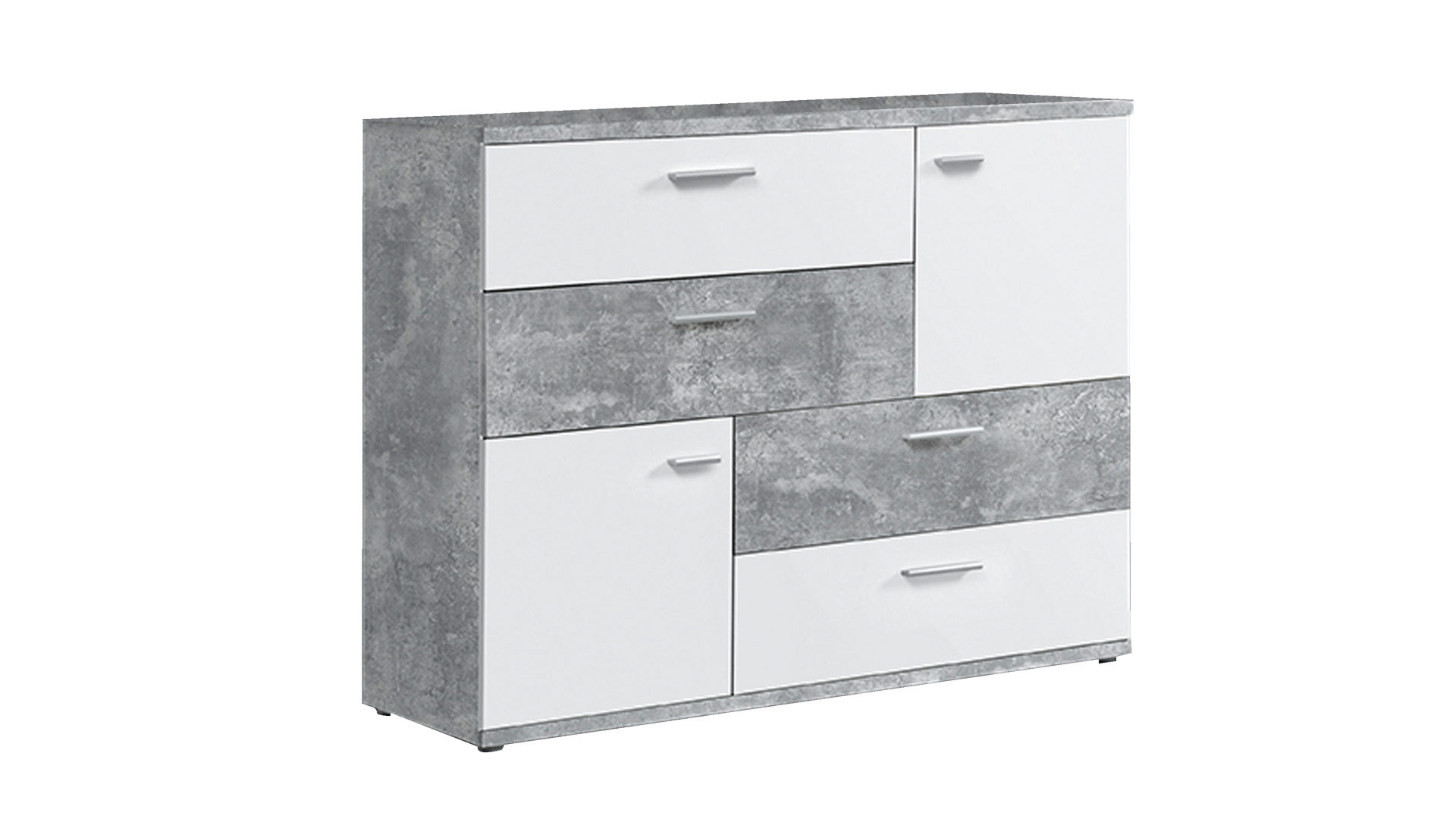 Absoluter Hingucker der Kommode ist die raffinierte Farbgebung: Mit weißen und betonfarbenen Kunststoffoberflächen harmoniert das vielseitig einsetzbare Wohnzimmermöbel mit Wohnkonzepten im skandinavischen Stil oder Industrial Design. Die versetzten Türen runden den Look der ca. 125 x 96 x 41 cm (BxHxT) großen Kombikommode ab und machen diese zu einem unverzichtbaren Blickfang in Ihren vier Wänden.