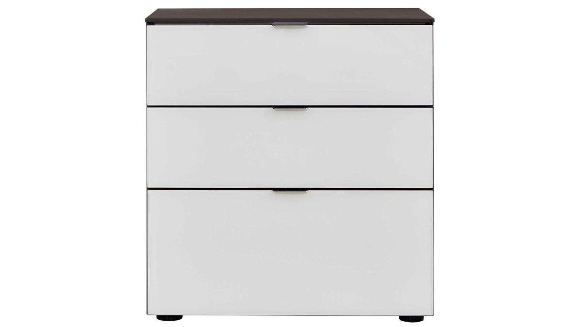 Zur Nachtkonsole gehören drei Schubladen - davon eine größere unten und zwei kleinere oben - mit praktischem Vollauszug. Darin können Sie verschiedene Gegenstände, die Sie in Bettnähe licht- und staubgeschützt aufbewahren wollen, bequem unterbringen - beispielsweise Ihre Lesebrille. Der Softeinzug sorgt dafür, dass sich die Schubkästen leichtgängig und vor allem geräuscharm schließen lassen. Mit dem Oberboden verfügen Sie über eine zusätzliche Ablagefläche, auf der etwa das Buch Platz findet, das Sie jeweils gerade lesen. Die Maße der erstklassig verarbeiteten Schubladenkommode belaufen sich auf ca. 58 x 63 x 40 cm (BxHxT).