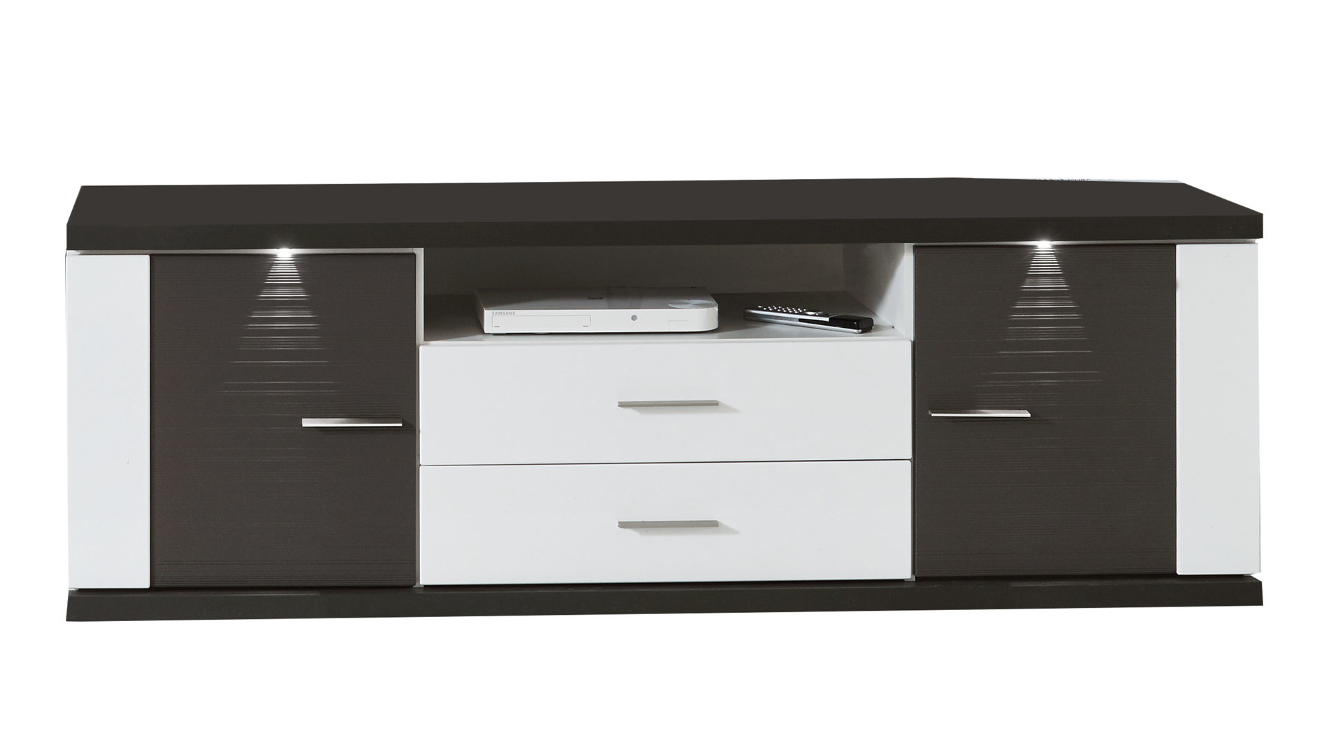 Tolles Lowboard für Ihr Zuhause: Mit arcticweißen Hochglanzfronten und Absetzungen mit graphitfarbener Kunststoffoberfläche besticht dieses raffinierte Medienelement als Wohnmöbel. Der Korpus verfügt über arcticweiße Melaminoberflächen, die nicht nur stoß- und kratzfest, sondern auch lichtbeständig sind. Das Medien-Lowboard bietet mit zwei Schubladen, die im Innenraum in zwei Fächer unterteilt sind und zwei Türen, hinter denen sich jeweils ein Holzboden verbirgt, jede Menge Platz für Ihre Unterhaltungselektronik.