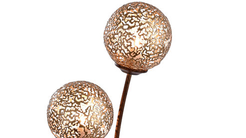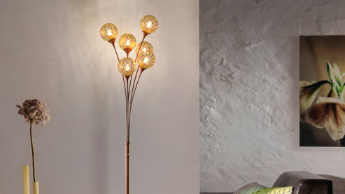Die raffinierte Standleuchte besteht aus rostfarbenem Metall, das zusammen mit goldfarbenen Lampenschirmen einen harmonischen modernen Look erzeugt. Die sechs kugelförmigen Leuchtenköpfe des Wohnaccessoires spenden angenehmes Licht und setzen dekorative Akzente in Ihrem Wohnkonzept.