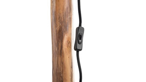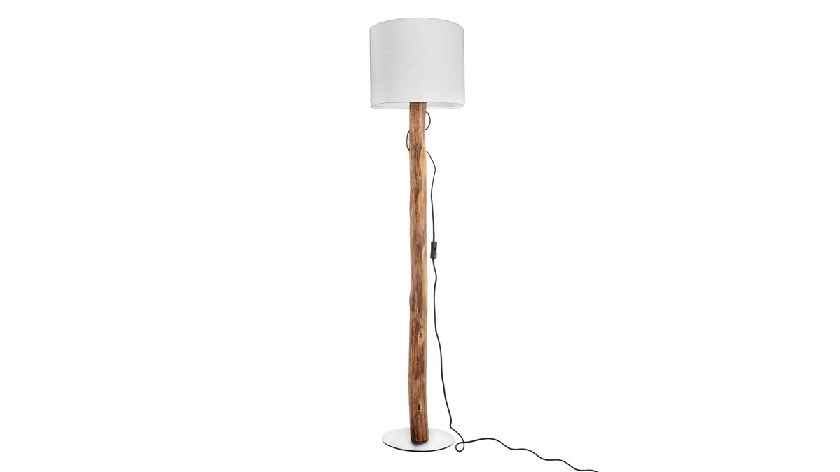 Eukalyptusholz, weißer Textil-Lampenschirm und silberfarbenes Metall