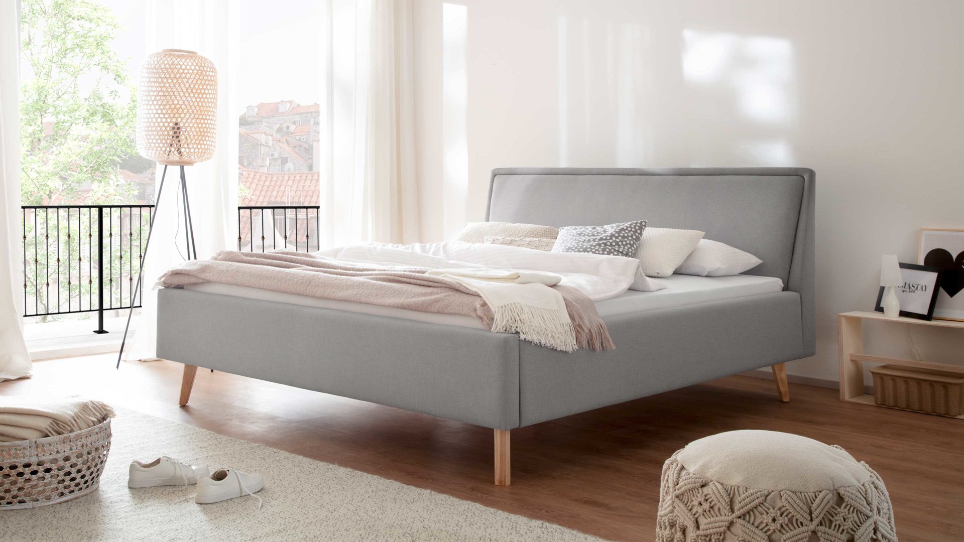 Das Polsterbettgestell Frieda mit Bettkasten verkörpert modernen Komfort. Mit dem hellgrauen Stoffbezug und den eichefarbenen Holzfüßen präsentiert es sich elegant und gemütlich designt. Die Bettseiten sind genauso wie das Polsterkopfteil glatt bezogen. Letzteres ist eine angenehm weiche Rückenlehne, wenn Sie abends im Bett vor dem Schlafen noch entspannt in Ihrem Buch lesen oder fernsehen möchten.
