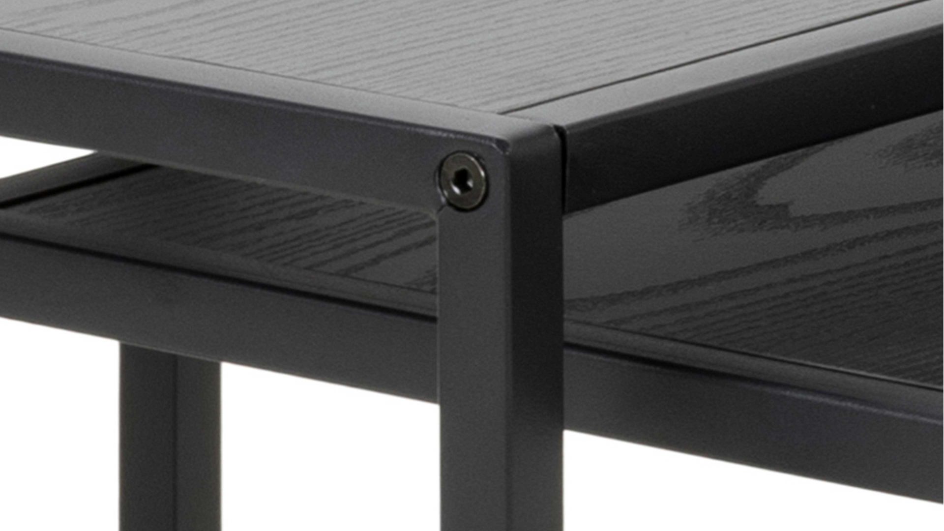 Die schicken Tischplatten in schwarzer Esche-Nachbildung sind der neue Blickfang in Ihrem Zuhause und werten Ihre Wohnräume optisch auf. Das schwarz pulverbeschichtete Stahlgestell mit rauer Oberfläche sorgt für die nötige Stabilität der Tische. Die Melaminoberfläche ist kratz- und stoßfest und damit ausgesprochen robust.